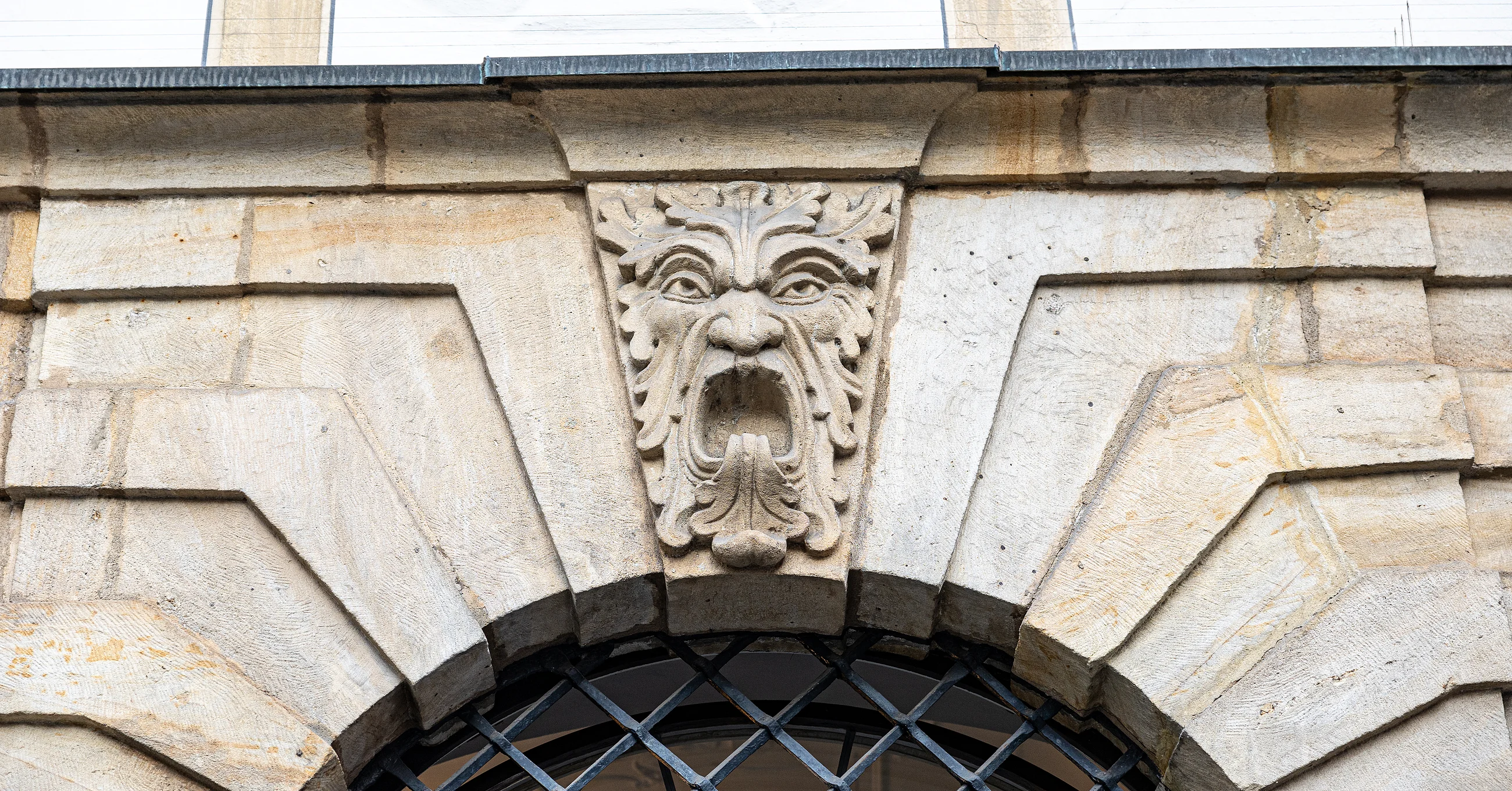 Eine der bekanntesten Masken und zugleich auch die älteste der Stadt ist die die Blattmaske am Konsolstein des Bamberger Reiters im Bamberger Dom. Weitere dieser so genannten Blattmasken lassen sich aber auch am Pfahlplätzchen bestaunen.