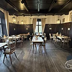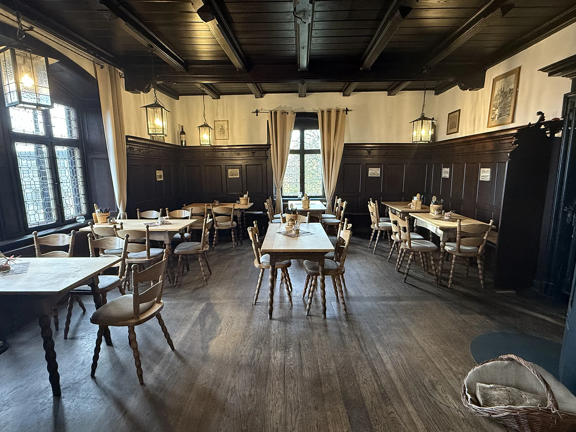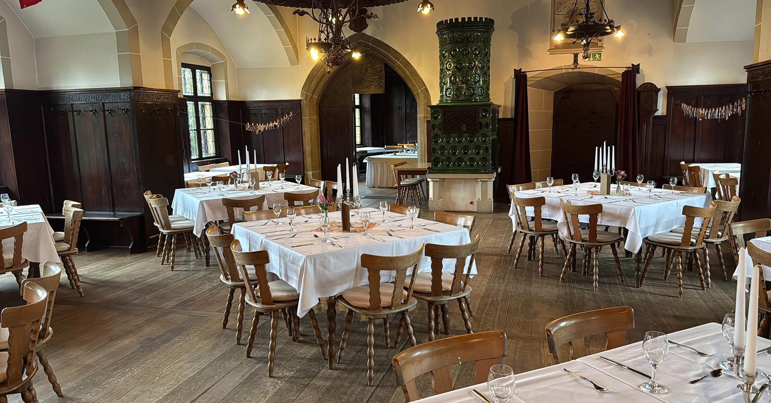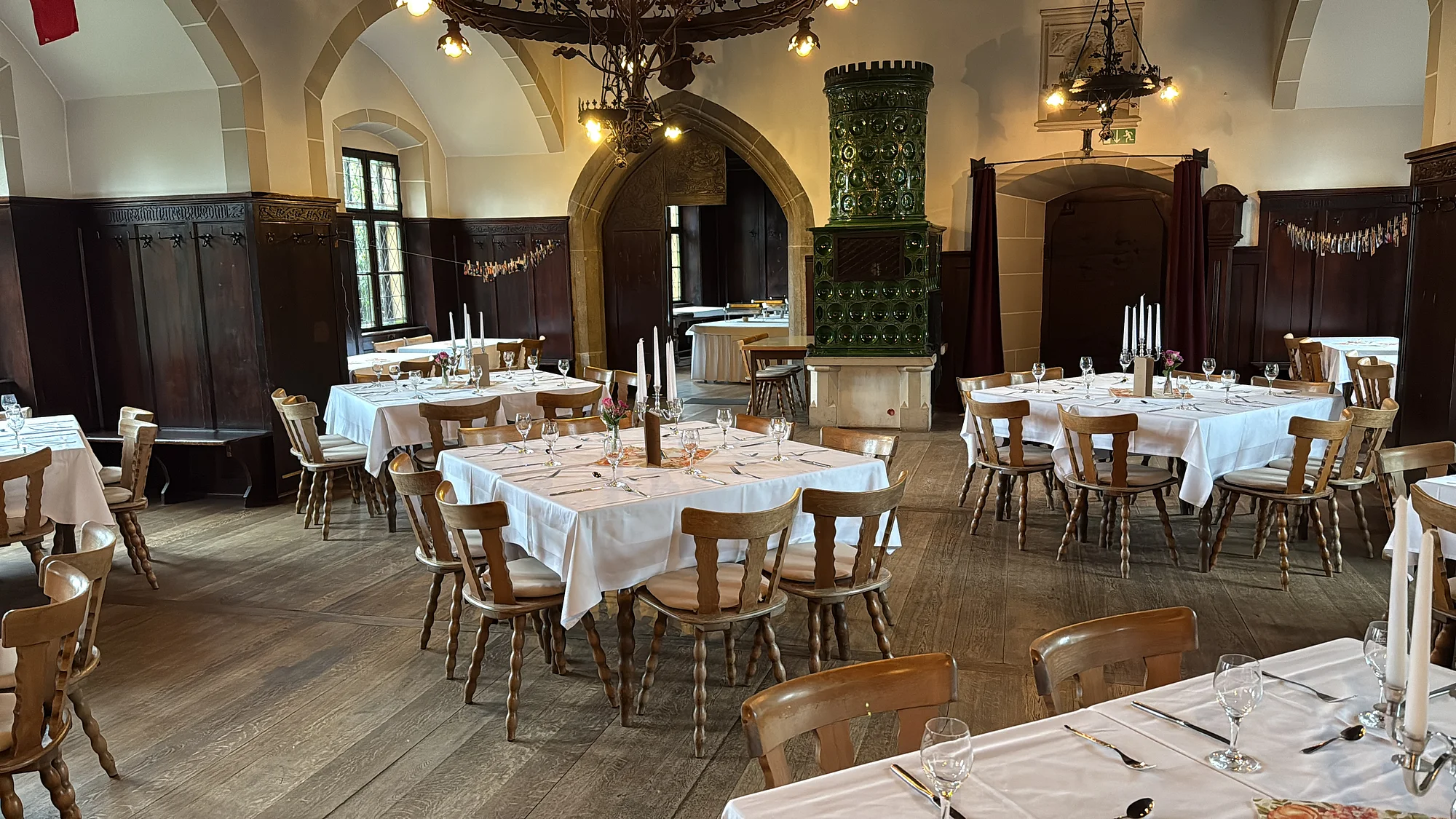Holzbeheizter Kamin im Gastraum, Rittersaal mit 100 Sitzplätzen