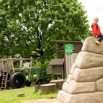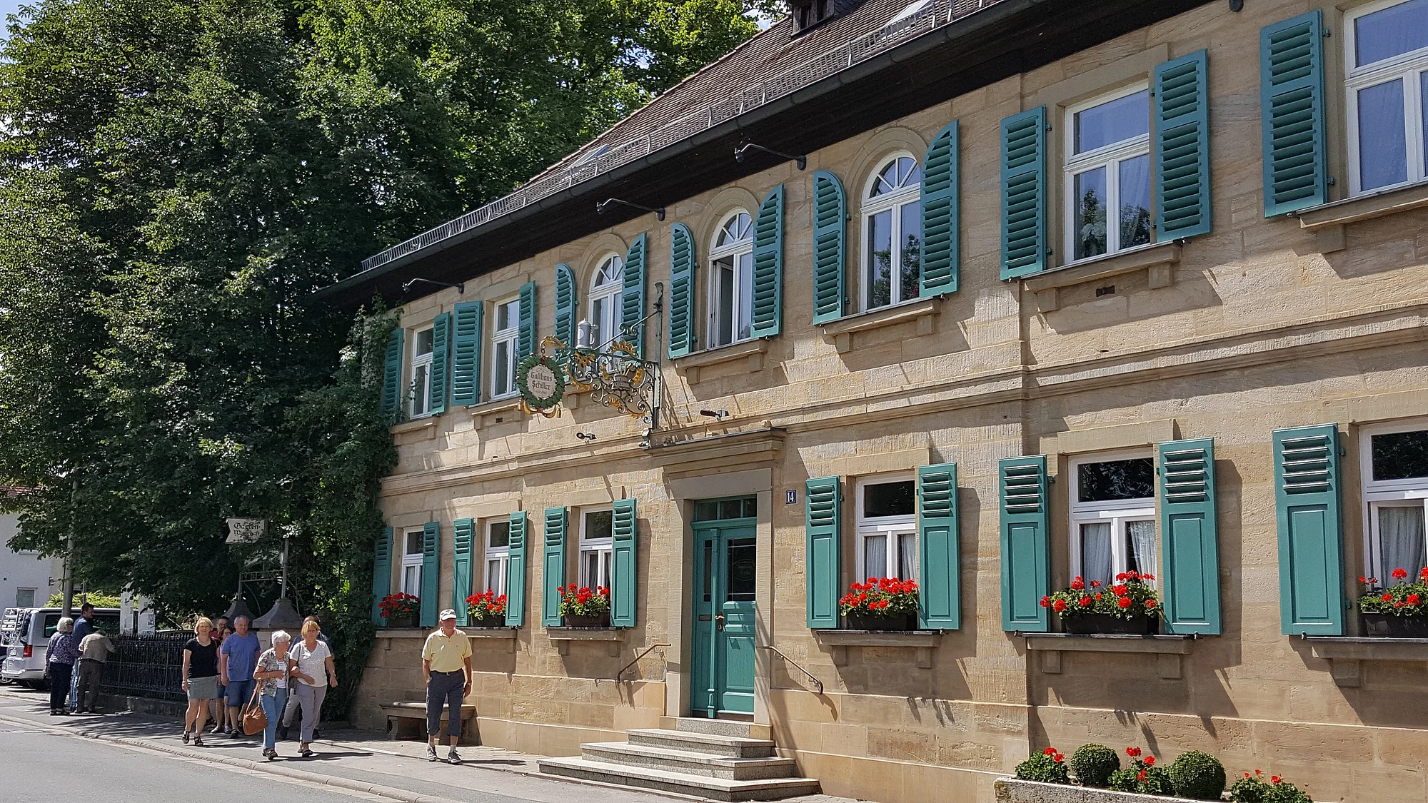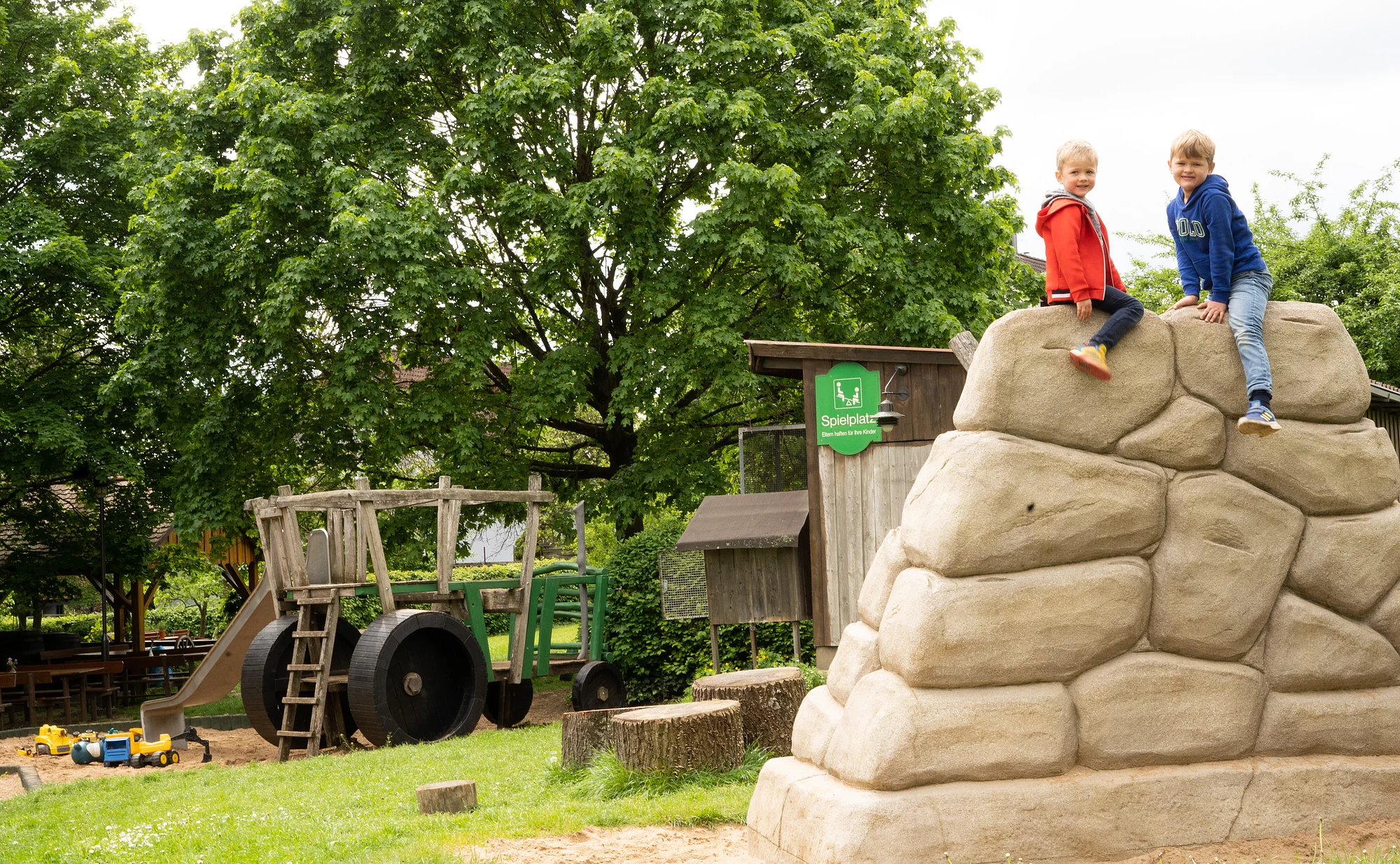 Idyllischer Biergarten mit alten Linden und Kastanienbäumen, sonnige Liegewiese unter Obstbäumen und Kinderspielplatz, vier gemütliche Gaststuben.