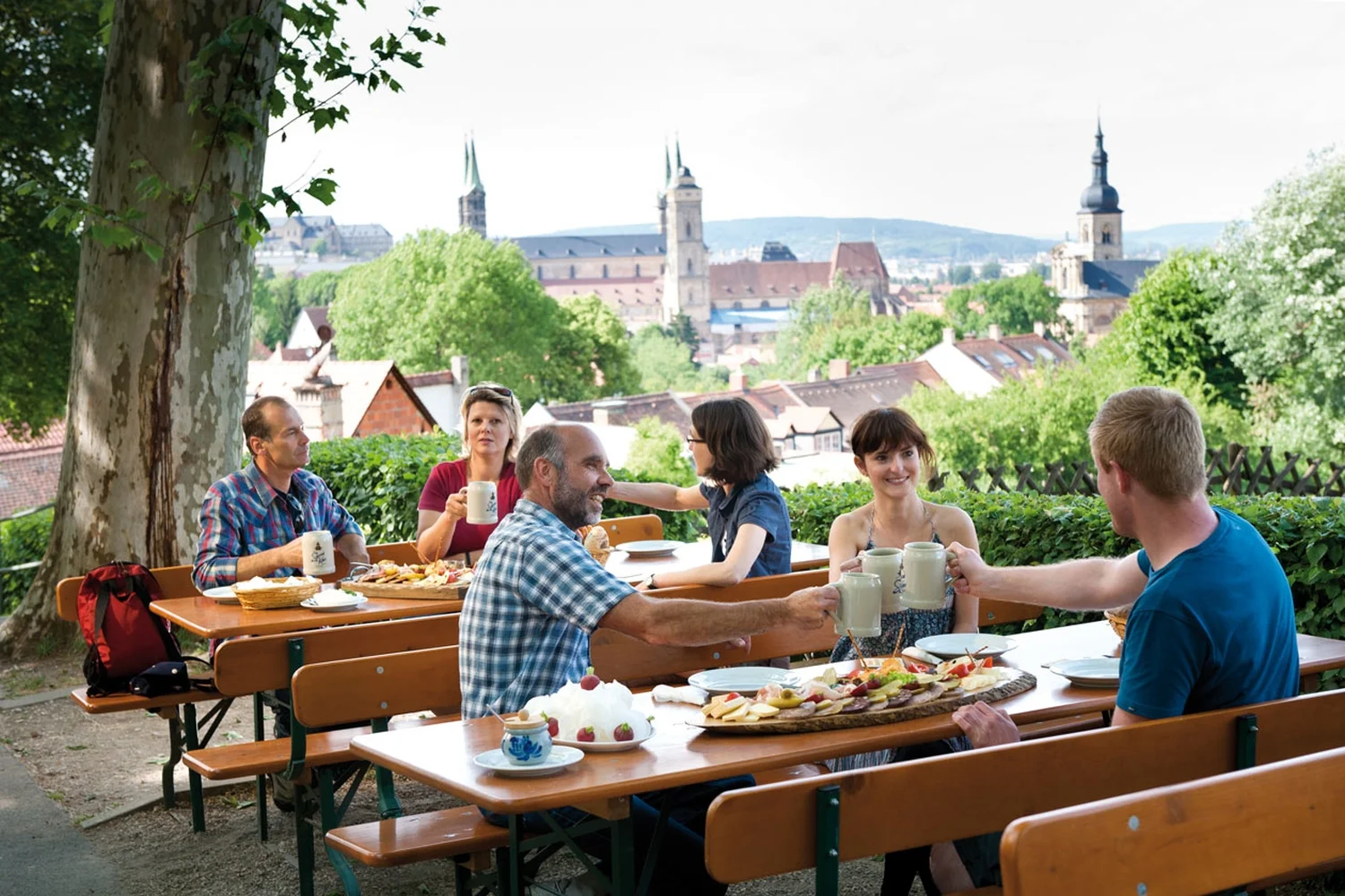 Traumhafte Sonnenuntergänge hoch über Bamberg: Auf dem Spezial-Keller – auch „Spezi-Keller“ bei den Bambergern – können Sie eine einmalige Aussicht auf den Kaiserdom, Kloster Michaelsberg und die Altstadt erleben. Genießen Sie dabei Bierspezialitäten aus der Brauerei Spezial und fränkische, bodenständige Küche.