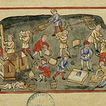 Kolorierter Holzschnitt zum sogenannten Pfennigwunder. Die heilige Kunigunde überwacht die gerechte Entlohnung der Arbeiter beim Bau der Kirche Sankt Stephan. Aus: Der Heiligen Leben. Nürnberg, Anton Koberger, 1488 Staatsbibliothek Bamberg Inc.typ.Ic.IV.20, Bl. LXIIIIv