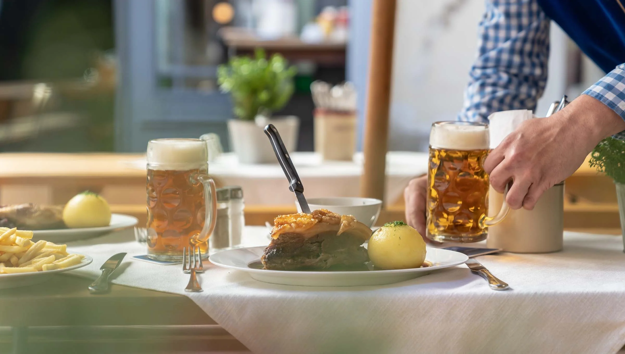 Fränkische Leberknödelsuppe, Schäuferla mit Sauerkraut und Kloß, Apfelkräpfla mit Vanilleeis inklusive ein Getränk nach Wahl (Änderungen vorbehalten) - Bamberger Spezialitäten