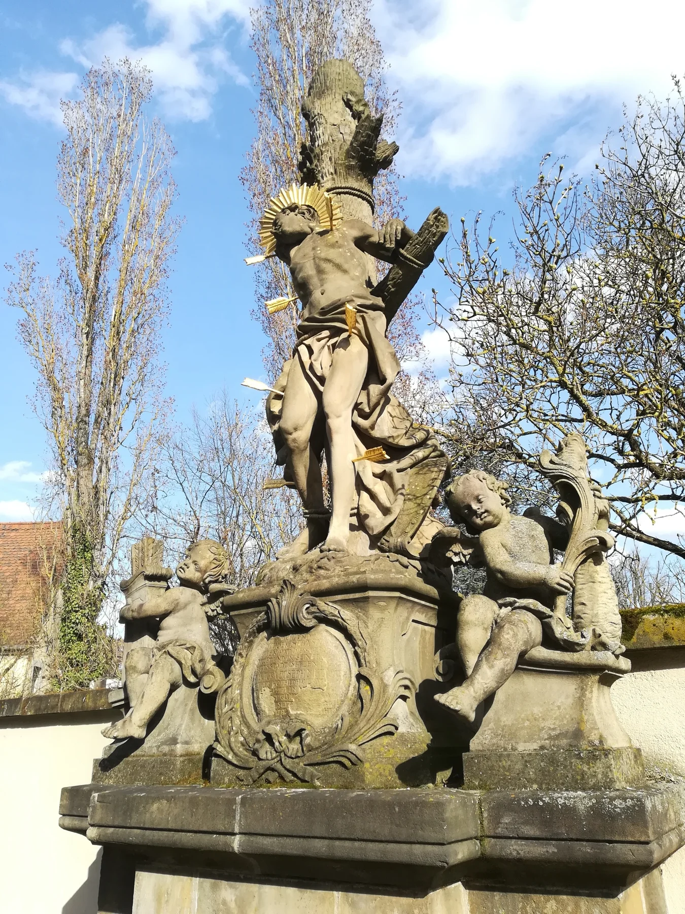 Die Figurengruppe wurde 1780 vom Martin Mutschele als Dank gestiftet und aufgestellt, da sein Bruder, der Hofbildhauer Bonaventura Joseph Mutschele unbeschadet den Pestausbruch in Moskau 1771 überstanden hatte.
