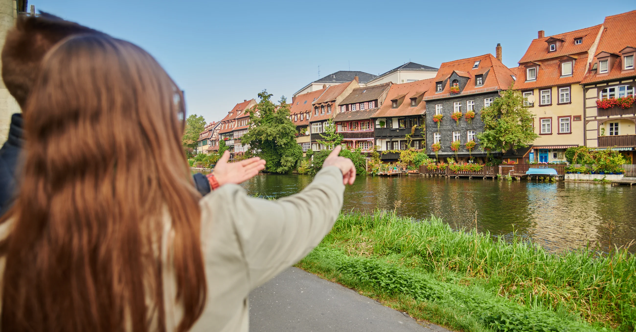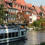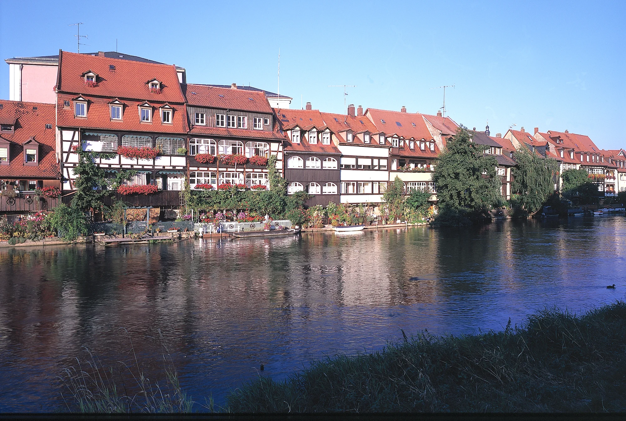 Die Fachwerkhäuser stammen überwiegend aus dem Mittelalter. Entlang der Regnitz reihen sie sich in einer hübsch geschmückten Zeile aneinander, Kähne dümpeln an den Anlegestellen in den Vorgärten. Mit dem Ausflugsschiff fährt man heute direkt an dieser einmaligen Häuserzeile vorbei.