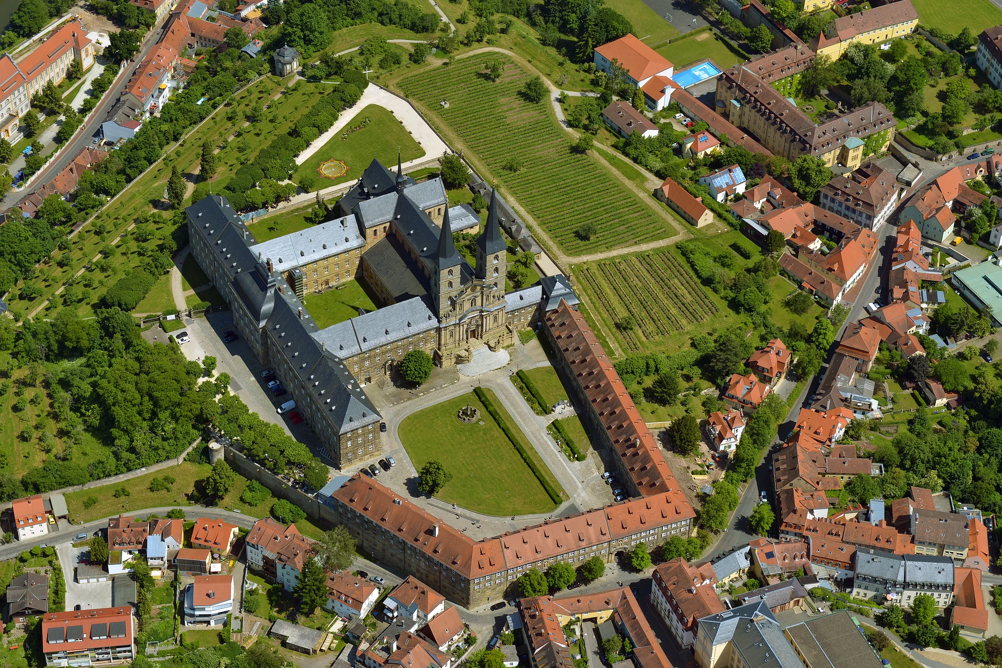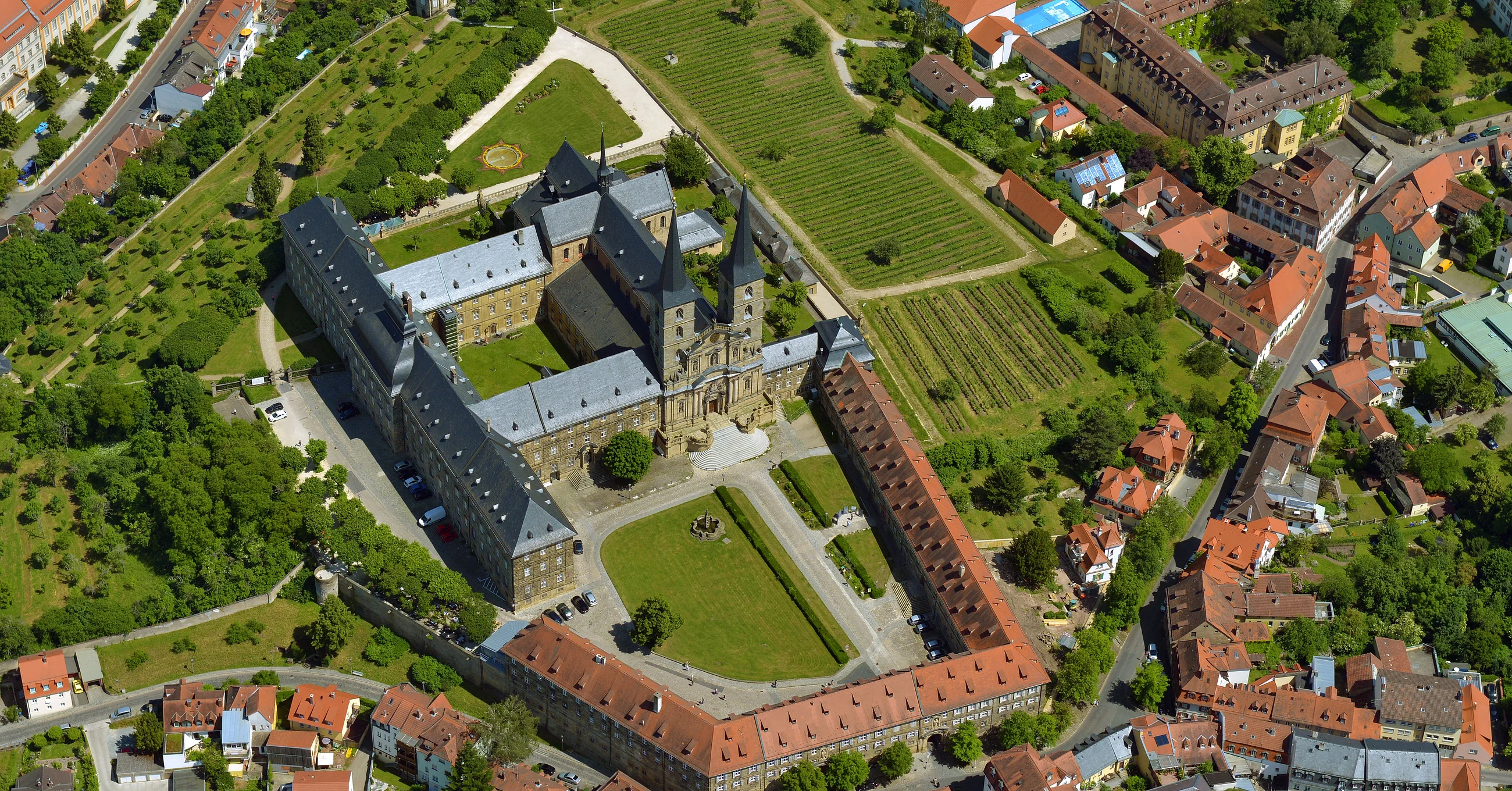 Von der Terrasse hinter der Kirche bietet sich ein weiter Panoramablick über die Stadt. Lohnenswert ist ebenso ein Rundgang durch den Michaelsberger Garten, ein barocker Terrassengarten mit einem Brunnen und zwei Pavillons. Seit 2012 wachsen an den Hängen des wieder Weinreben, sodass Sie wieder einen echten Bamberger Silvaner im Bocksbeutel genießen können. Den Wein und eine exquisite Auswahl besonderer Geschenke aus dem Bamberger Stiftsgarten finden Sie im Stiftsladen am Michelsberg.