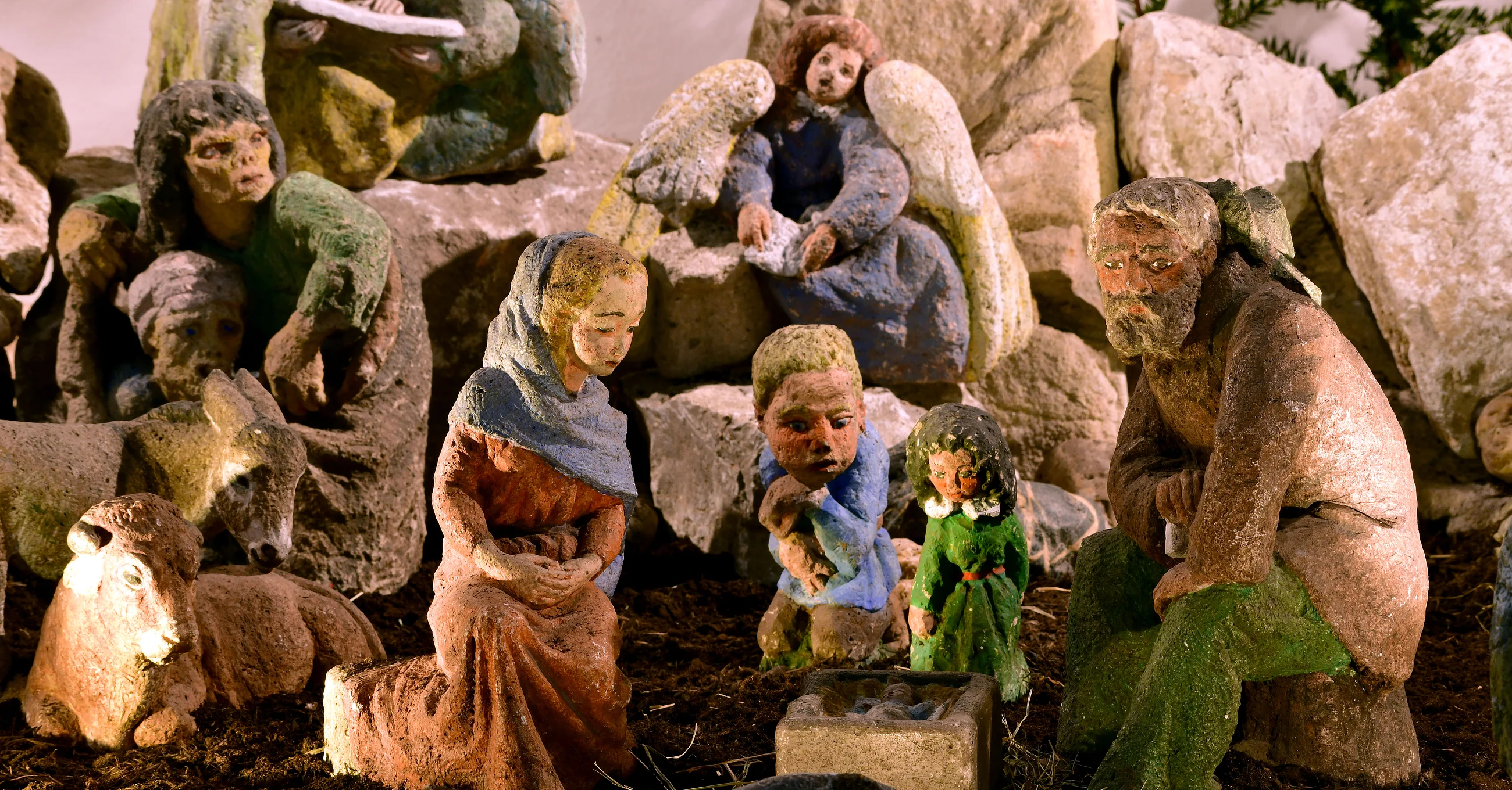 Zyklus der Krippenszenen: Verkündigung, Heimsuchung, Geburt/Heilige Nacht, Anbetung der Könige, Flucht nach Ägypten, Darstellung im Tempel, weitere Figuren aus der Kirchengeschichte
