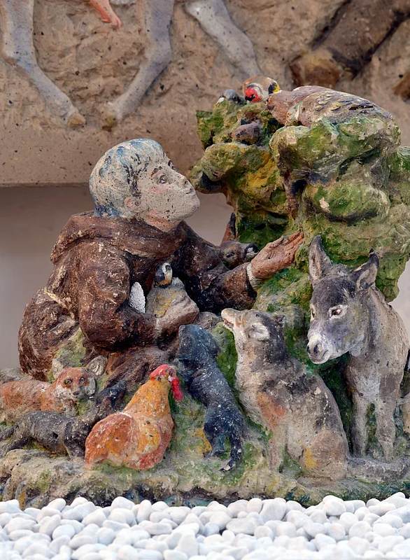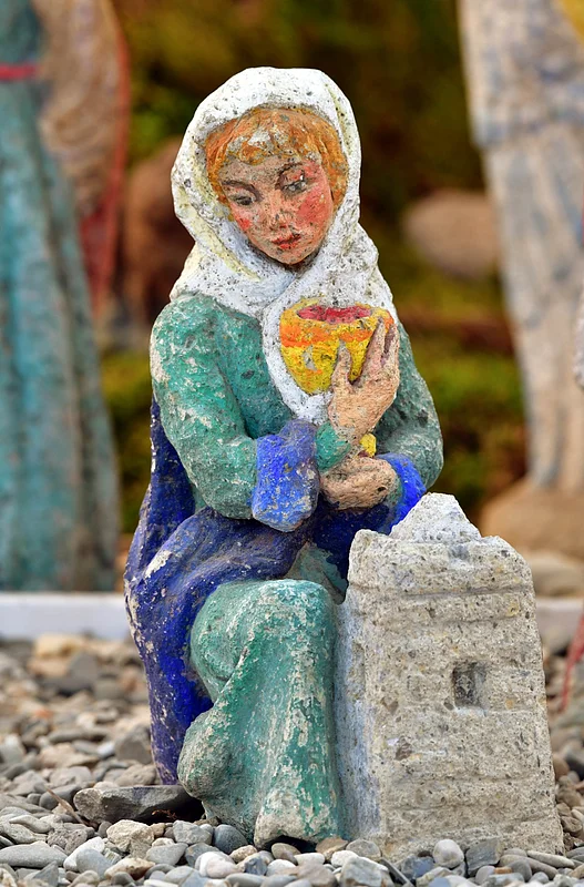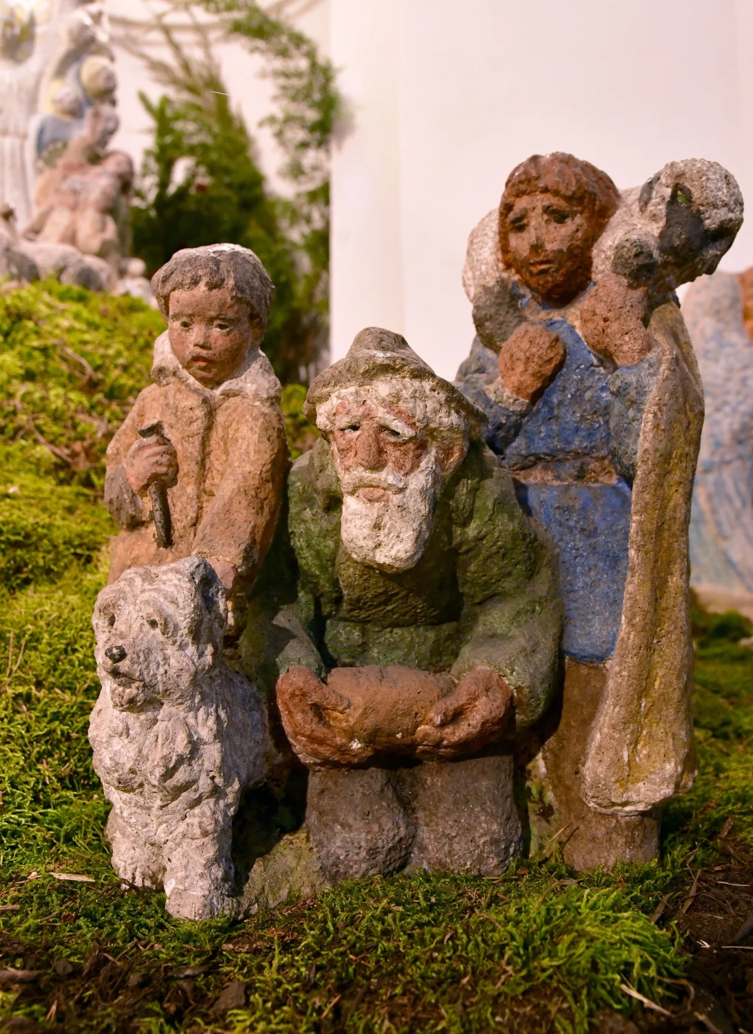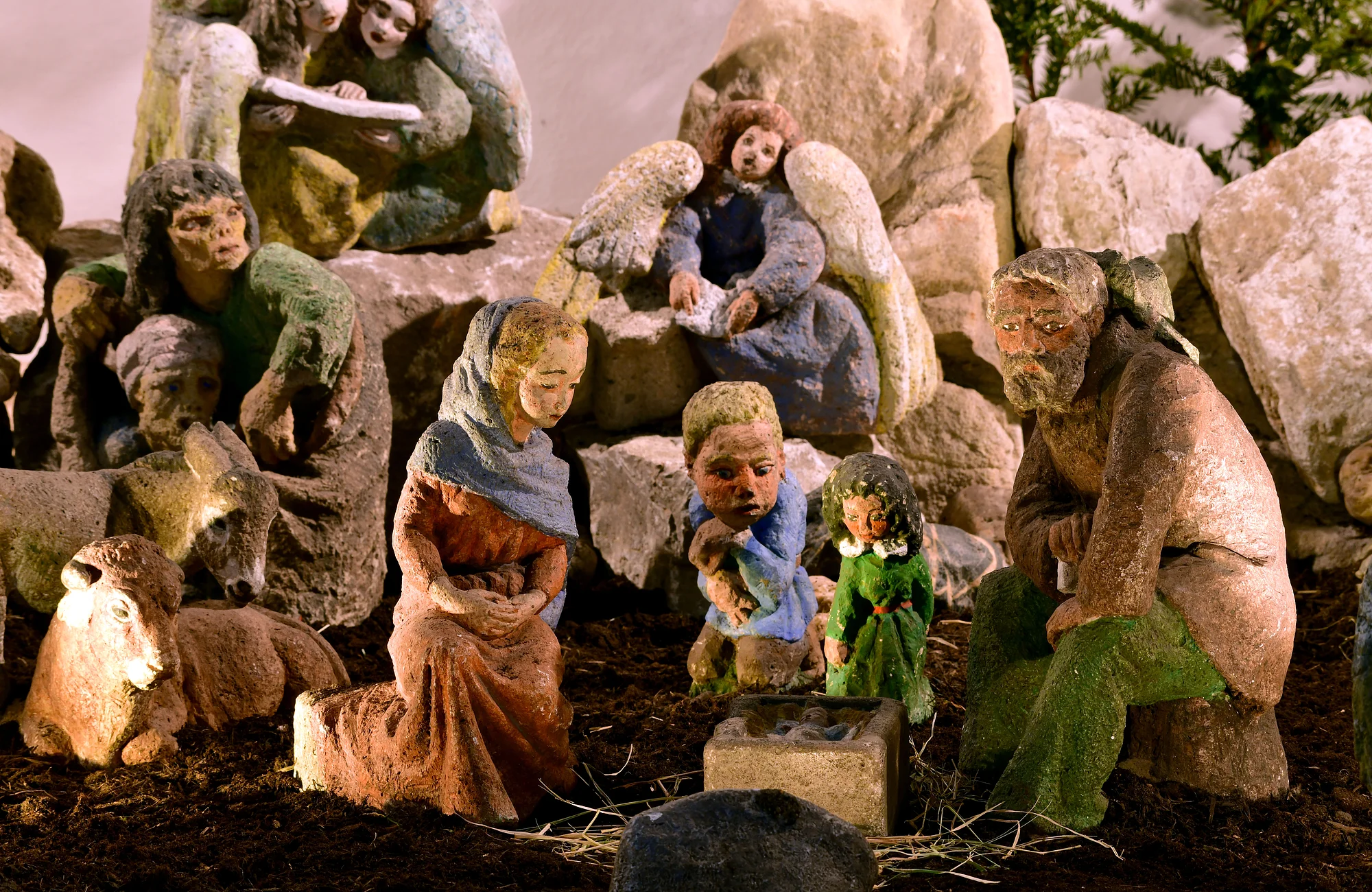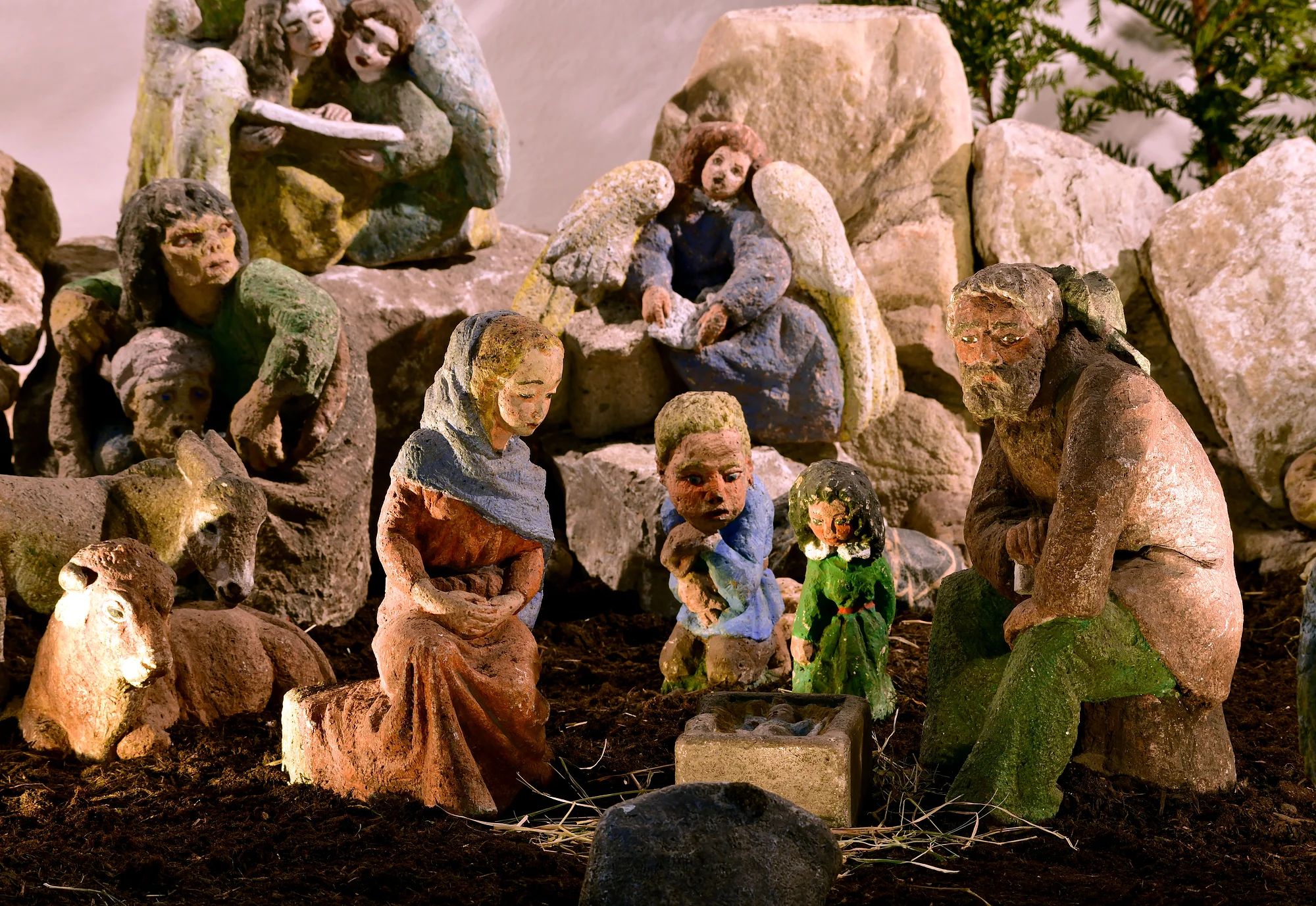 Eine Sehenswürdigkeit besonderer Art: Bis zu 80 cm große, aus farbig gefasstem Stein in modernem Stil geschaffene Figuren der Künstlerin Wini Bechtel-Kluge gestalten eine ca. 15 m² große Krippenlandschaft mit Szenen aus der Vor- und Nachweihnachtszeit sowie aus der Kirchengeschichte.