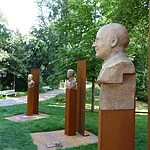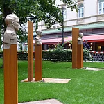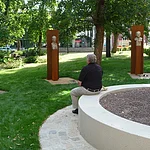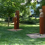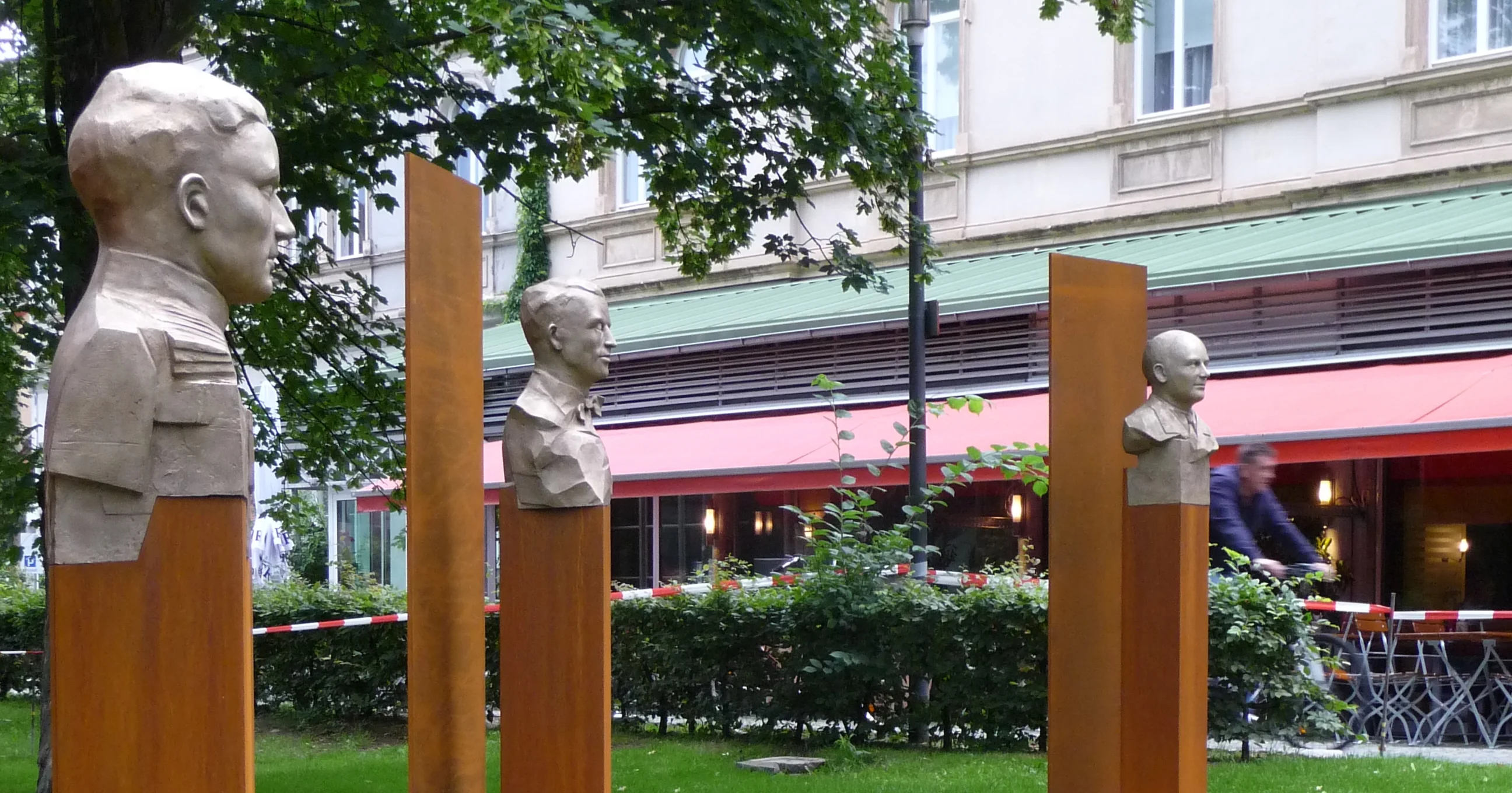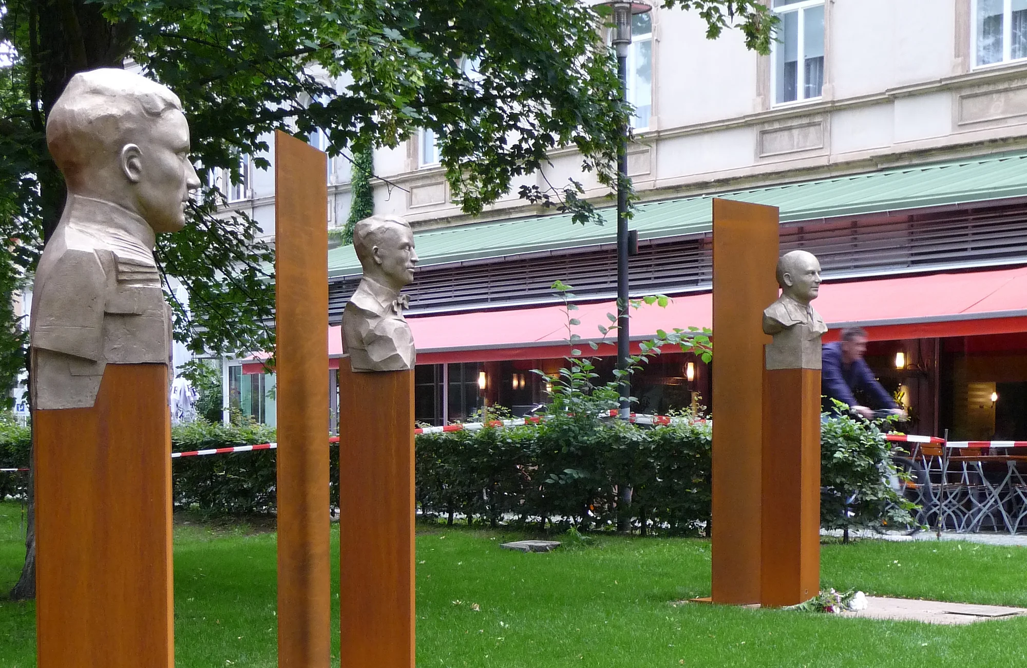 "Auf die nötige Zivilcourage in der Gegenwart weisen zwei weitere braune Steinplatten rechts und links der drei Büsten hin. Sie gehen in den Straßenbelag über. Sie zeigen in die Gegenwart und symbolisieren aktuelle Herausforderungen und Bedrohungen. Ganz konkret kann sich Jede und Jeder auf eine dieser leeren Platten stellen und sich befragen: „Wofür sollte ich heute aufstehen?“, „Wofür sollte ich meine Stimme erheben?“, „Wofür brauch ich heut Rückgrat und Charakter?“"