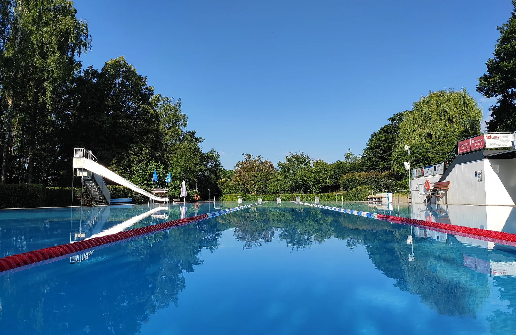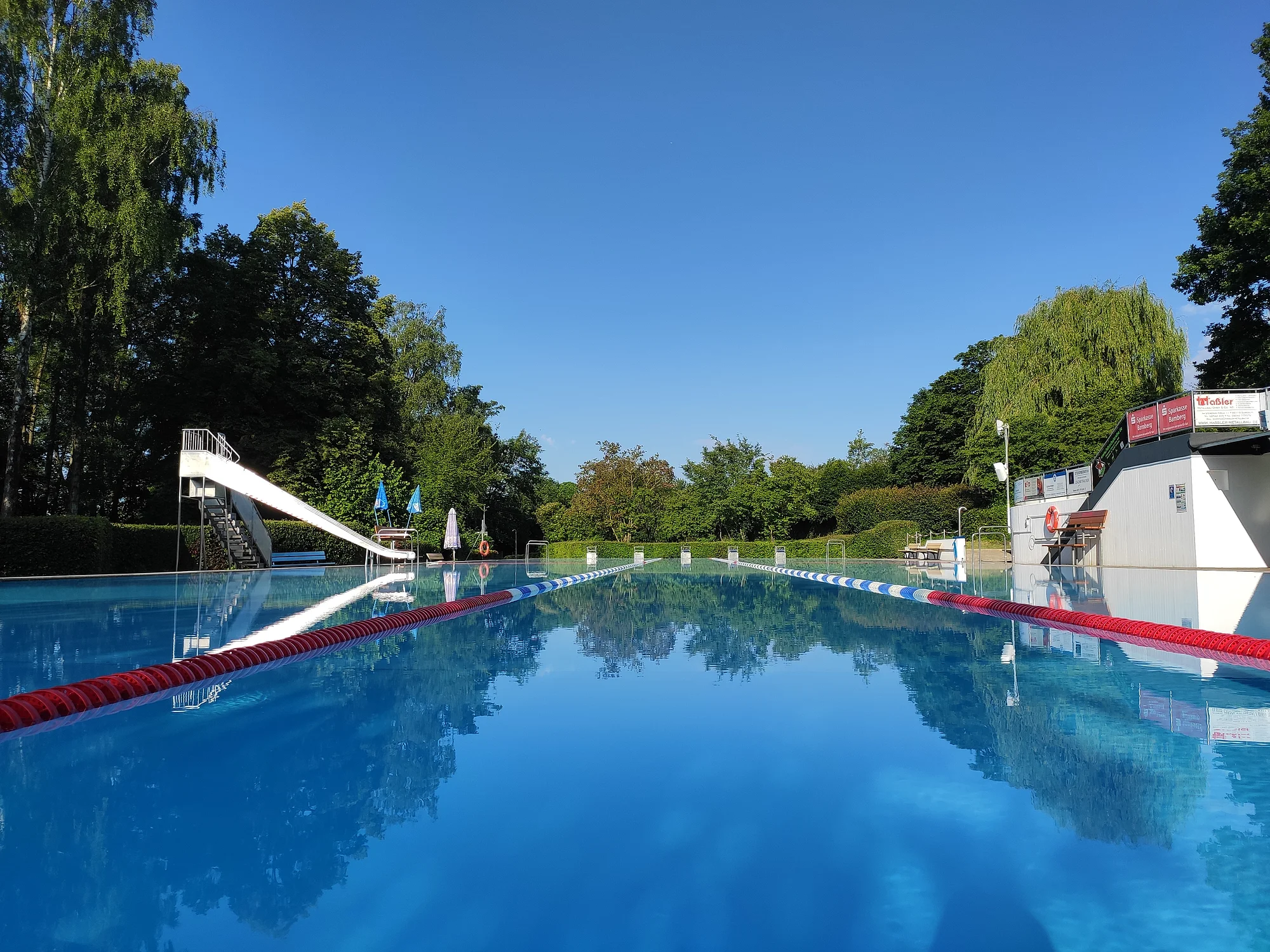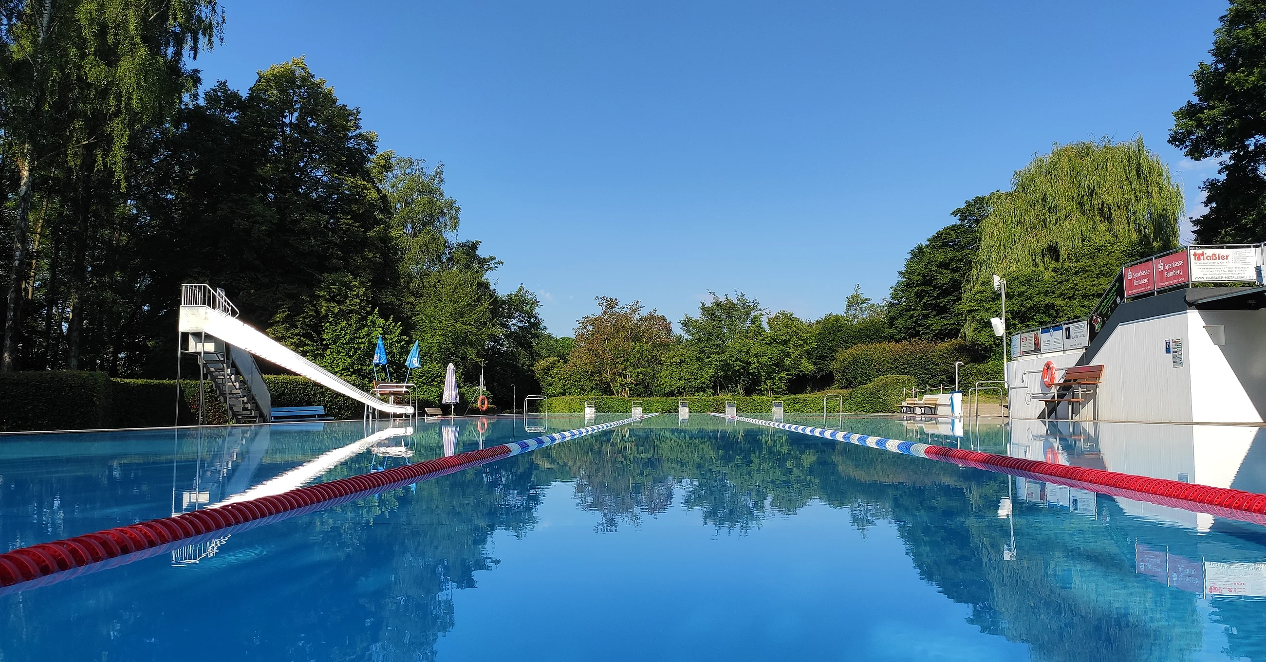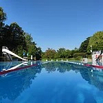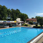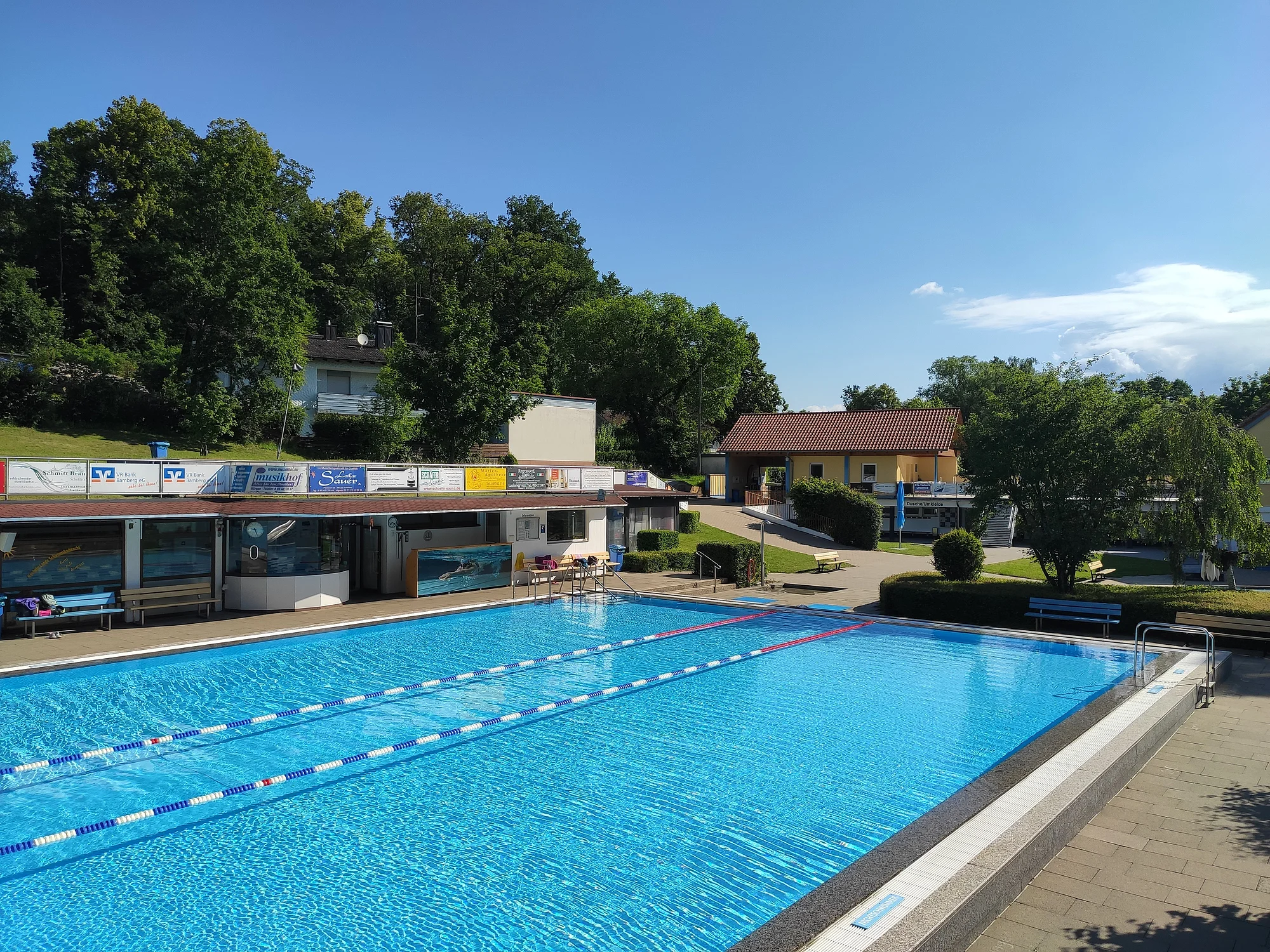 1935 erbaut, generalsaniert 1968, 2020 Sanitärtraktsanierung, 50-Meter-Schwimmbecken, vier Bahnen, 0,90 bis 3,20 Meter tief, 80 Quadratmeter Planschbecken mit Insel, 7500 Quadratmeter Gesamtfläche, 30-köpfige Wasserwachtgruppe hilft bei Aufsicht, öffentlicher kostenloser Parkplatz, Kiosk mit Terrasse, Familienbad