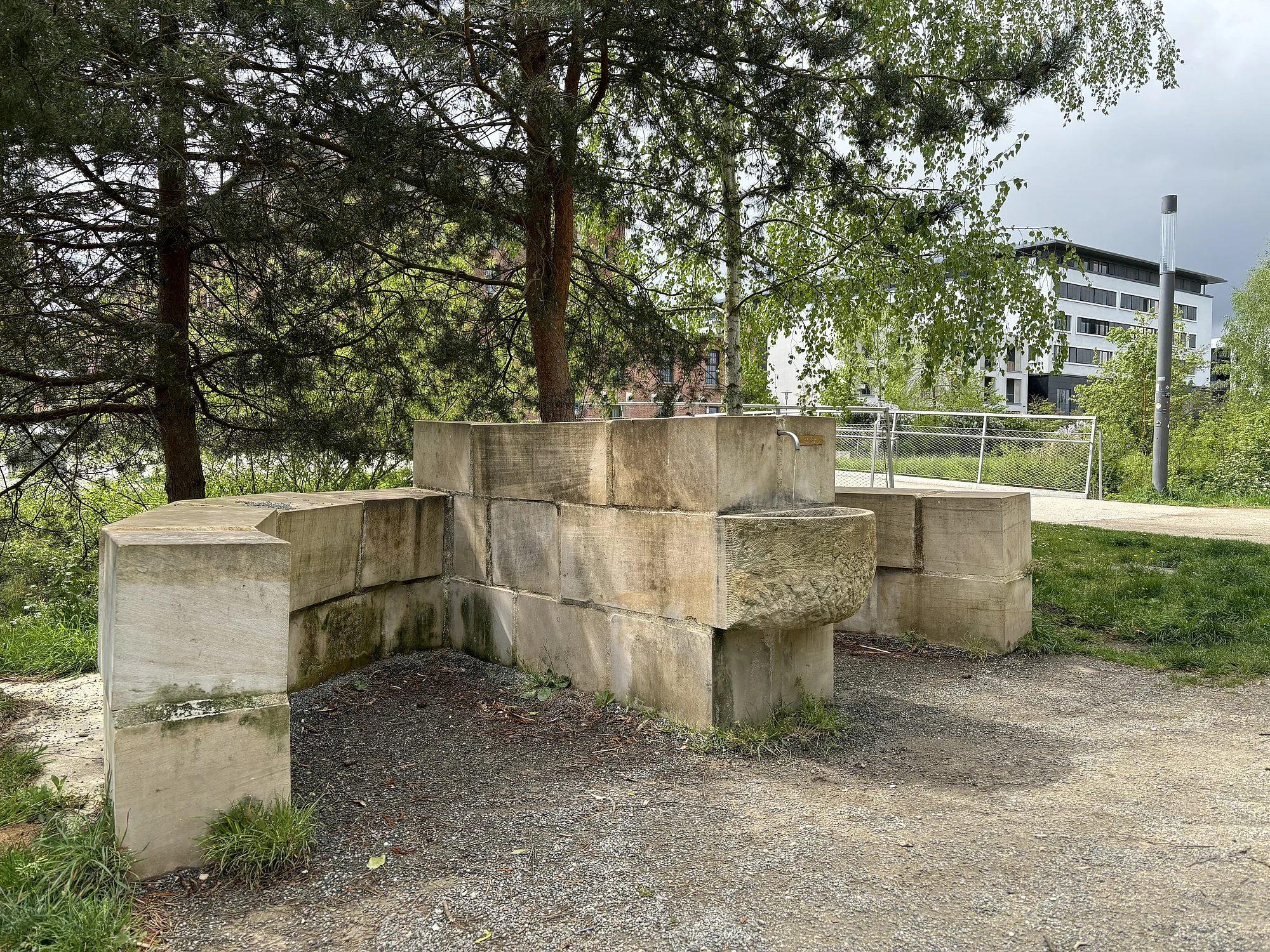 Der Trinkwasserbrunnen befindet sich auf der ERBA-Insel in direkter Nähe zum beliebten und belebten Spielplatz.