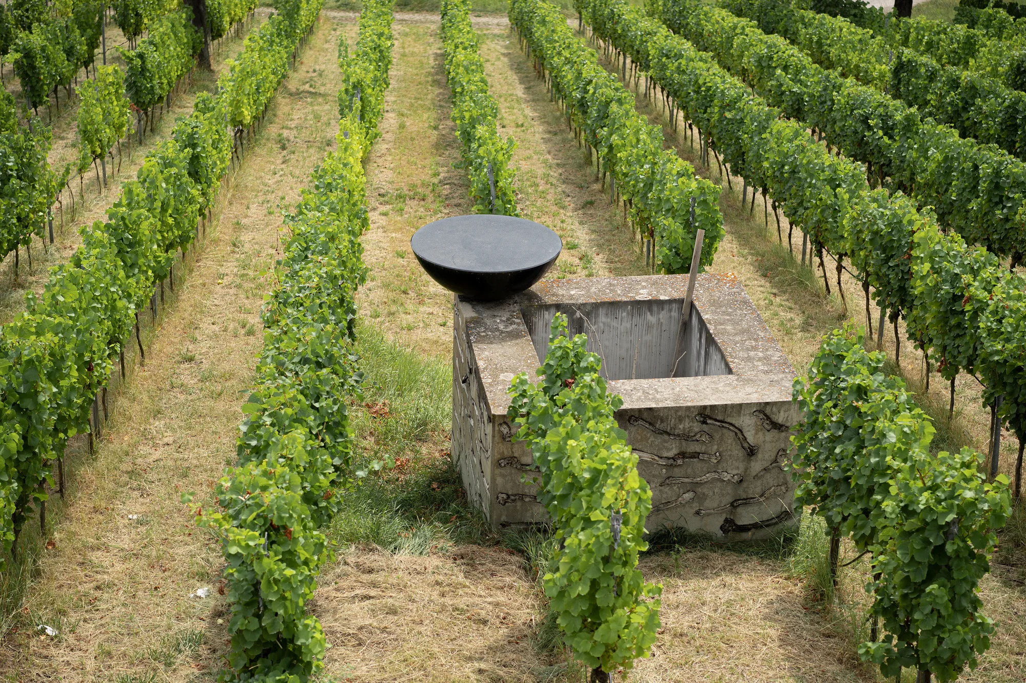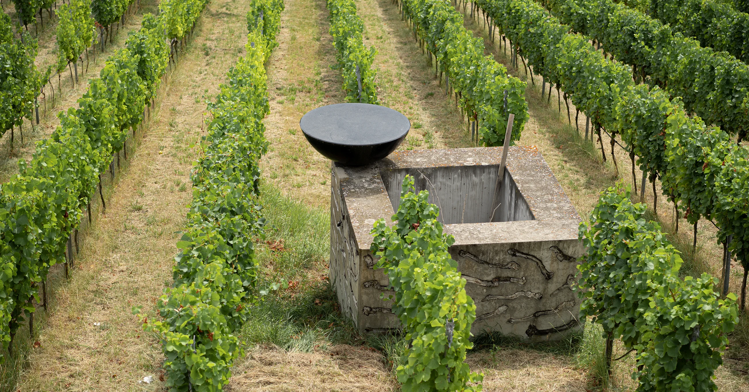 Eine polierte schwarze Granithalbkugel ruht auf einer Ecke des Brunnens. Ihre Form ähnelt einer Wasserschale, auf deren glänzender Oberfläche sich der Himmel oder die Türme des Bamberger Doms spiegeln – je nach Blickwinkel des Betrachters. Inzwischen wird der Hang wieder als Weinberg genutzt, so dass das Kunstwerk inmitten von Weinreben steht.