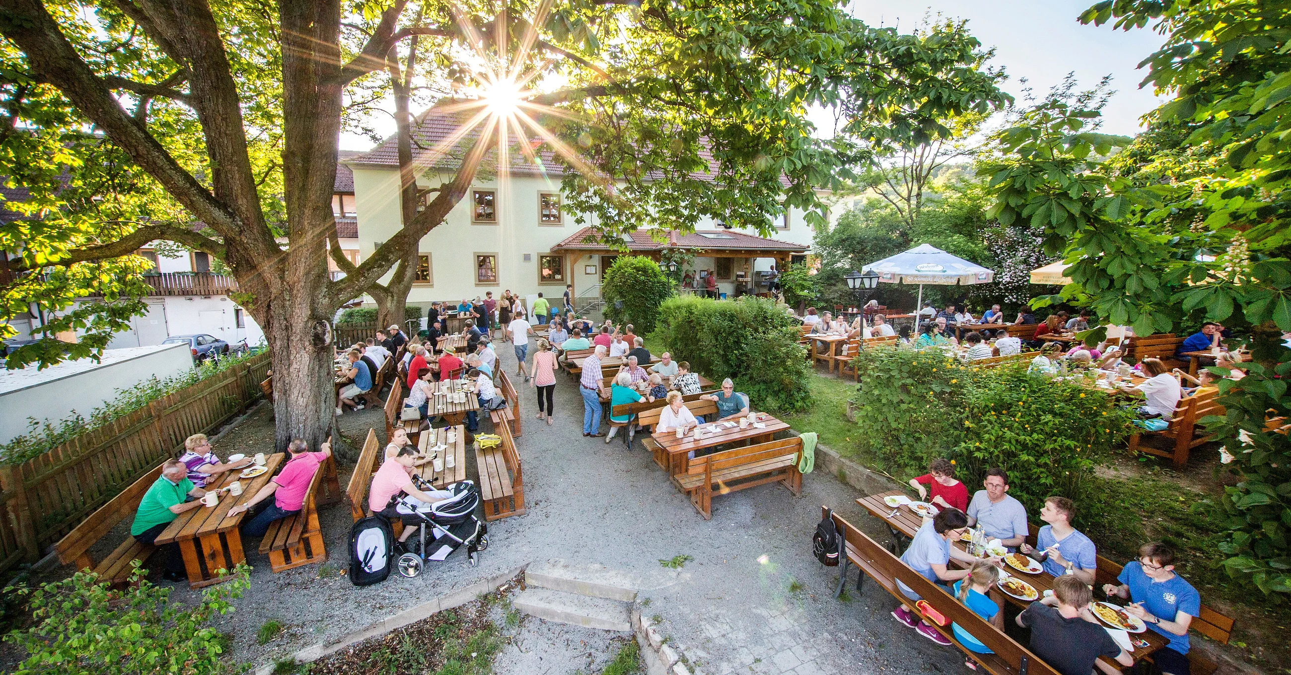 Das Anwesen liegt inmitten idyllischer Natur und in der gemütlichen Gaststätte sowie im urigen Biergarten mit Spielplatz kann man hausgemachte Brotzeiten sowie warme fränkische Spezialitäten genießen - und zwar zu einem fairen Preis! Wer länger bleiben will: die gemütlichen Gästezimmer sind frisch renoviert, es gibt ein kleines Biermuseum sowie die digitale Erkundungs-Tour „Neigschaut“.