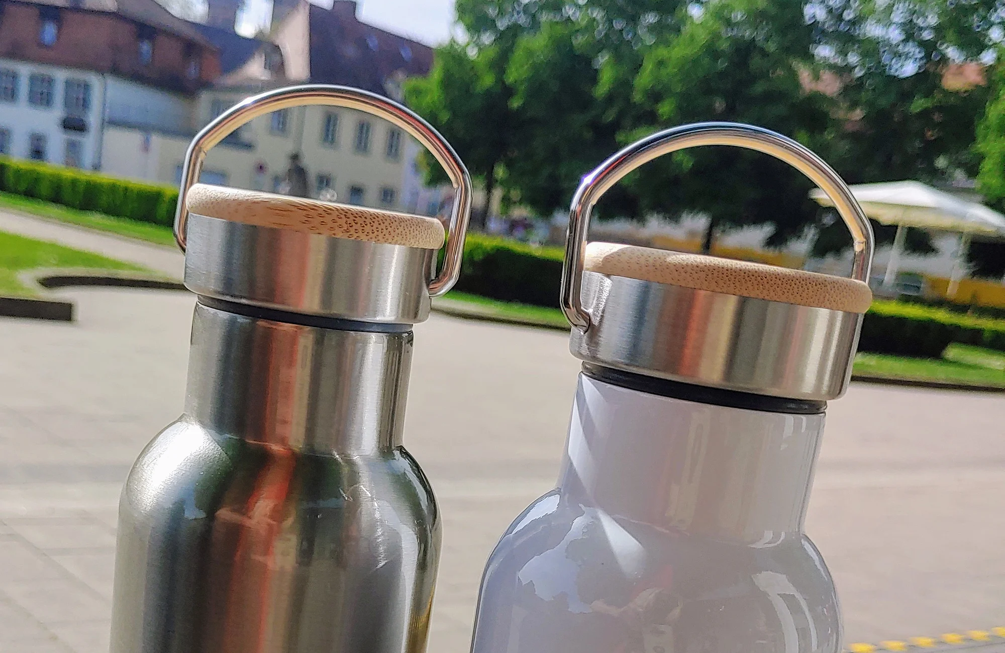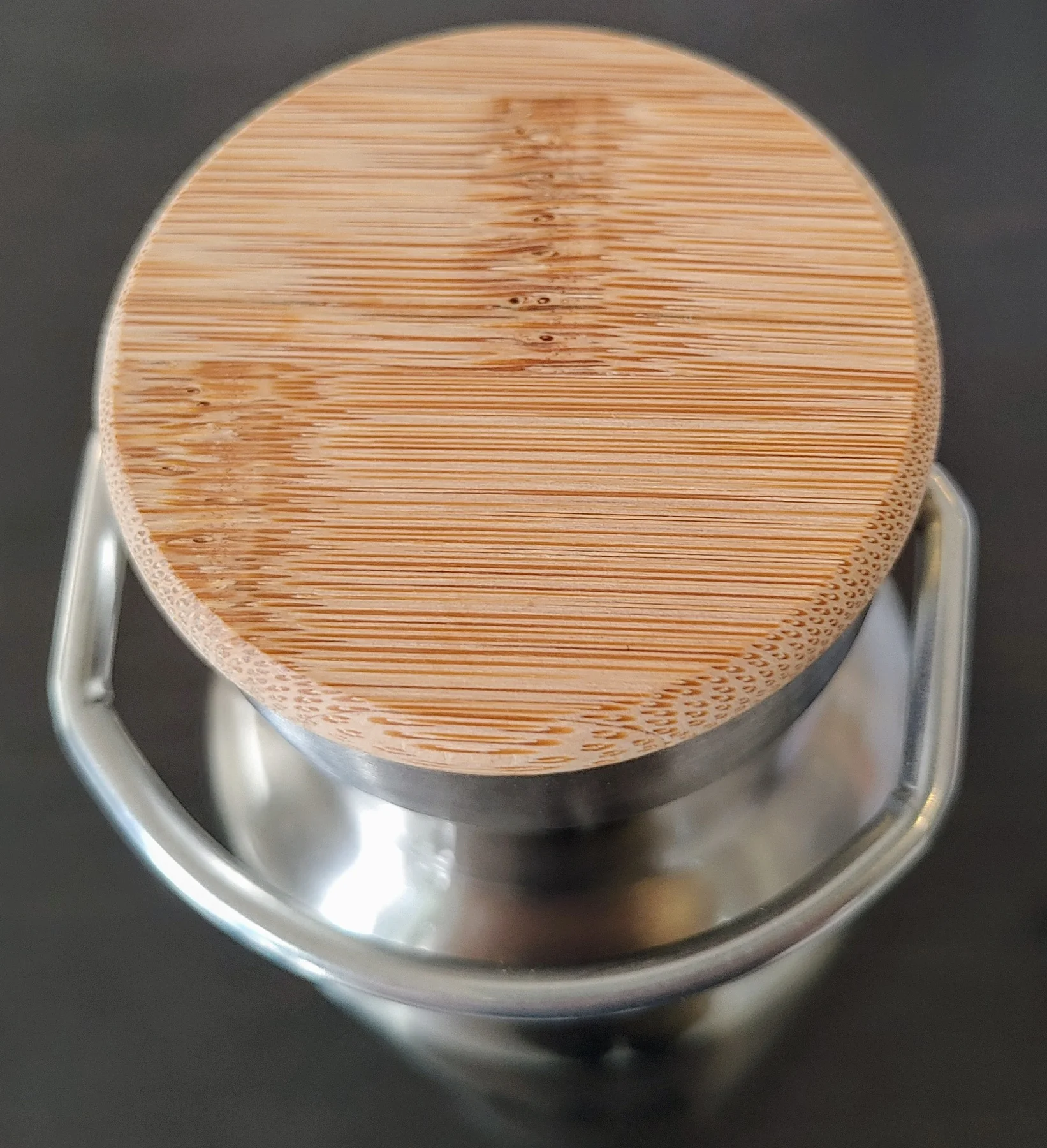 Der aufgeschraubte Deckel hat einen integrierten Bügel aus Edelstahl, der als Tragehilfe dient.