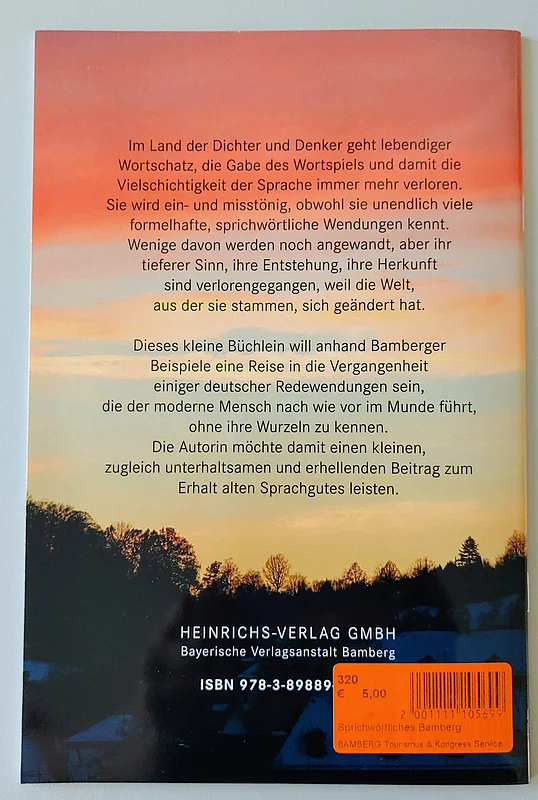Dieses kleine Büchlein will anhand Bamberger Beispiele eine Reise in die Vergangenheit einiger deutscher Redewendungen sein, die der moderne Mensch nach wie vor im Munde führt, ohne ihre Wurzeln zu kennen. Die Autorin möchte damit einen kleinen, zugleich unterhaltsamen und erhellenden Beitrag zum Erhalt alten Sprachgutes leisten.