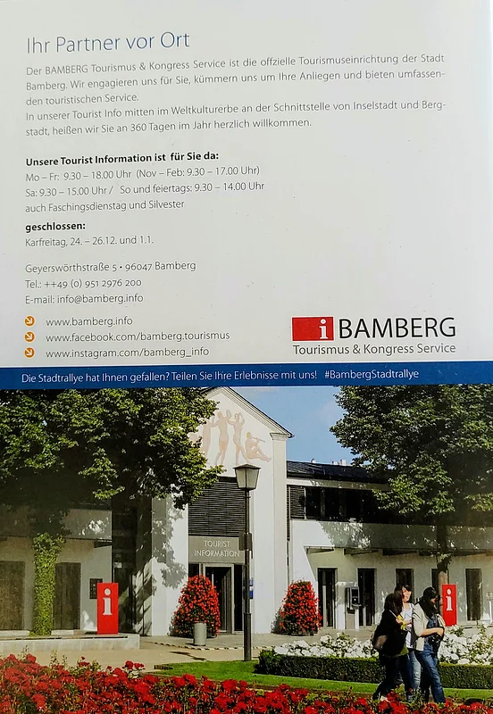 Begeben Sie sich mit der Stadtrallye auf einen Spaziergang durch das Weltkulturerbe Bamberg. Die kurzweilige Stadtrallye führt Sie quer durch die Berg-, Insel- und Gärtnerstadt und lässt Sie Wissenwertes aber auch weniger Bekanntes erfahren. Auf geht’s zur Spurensuche durch das Weltkulturerbe!