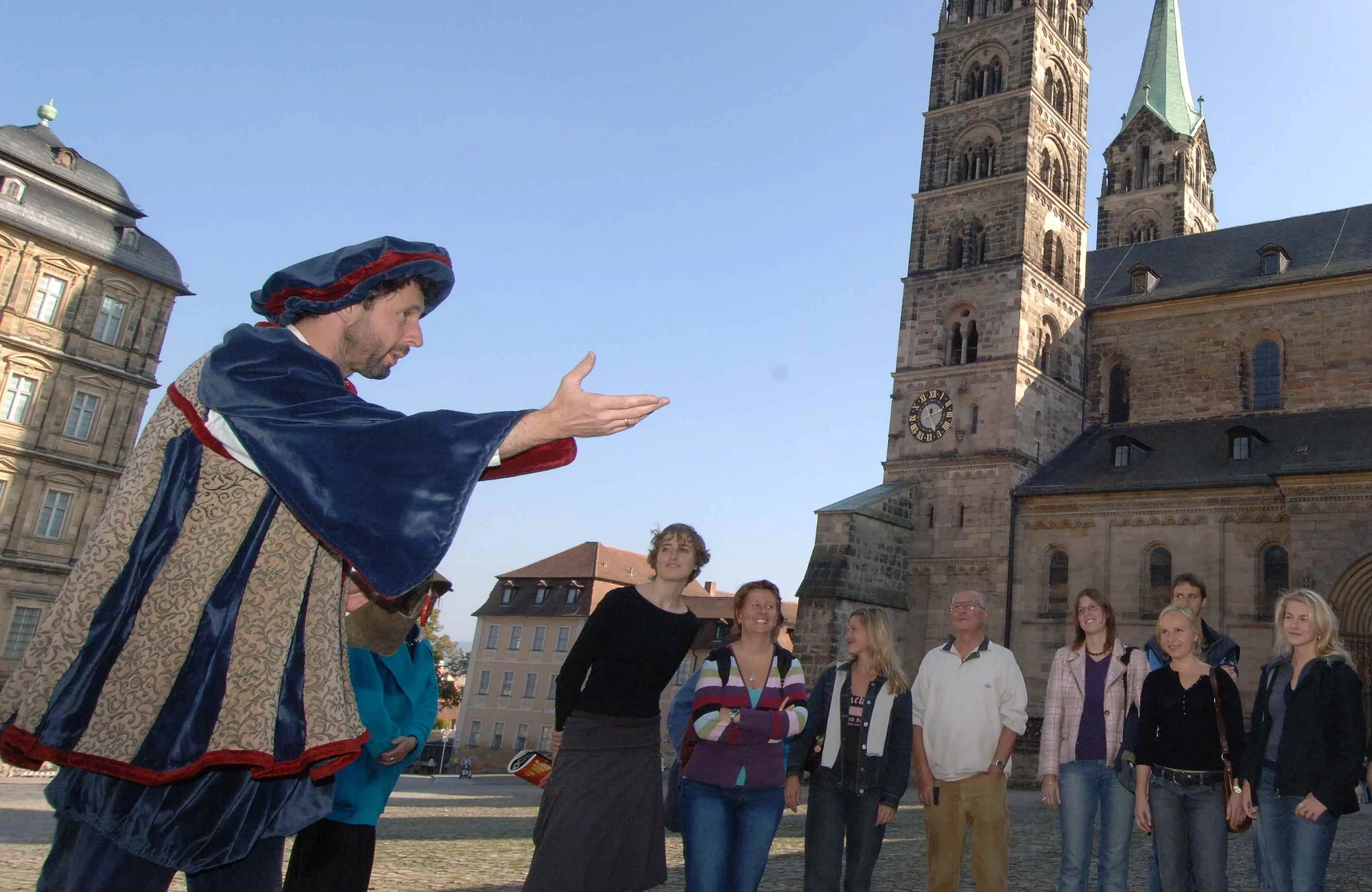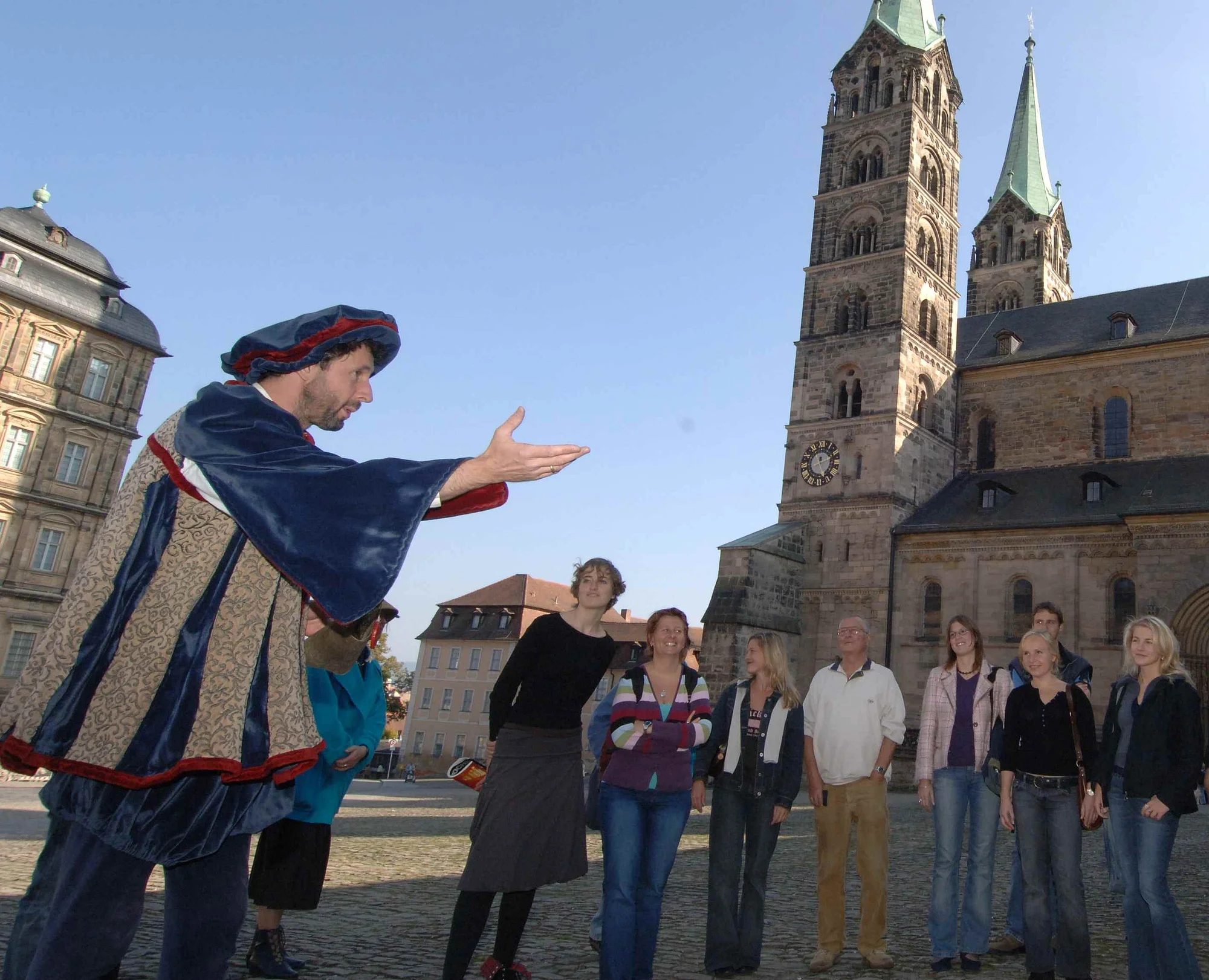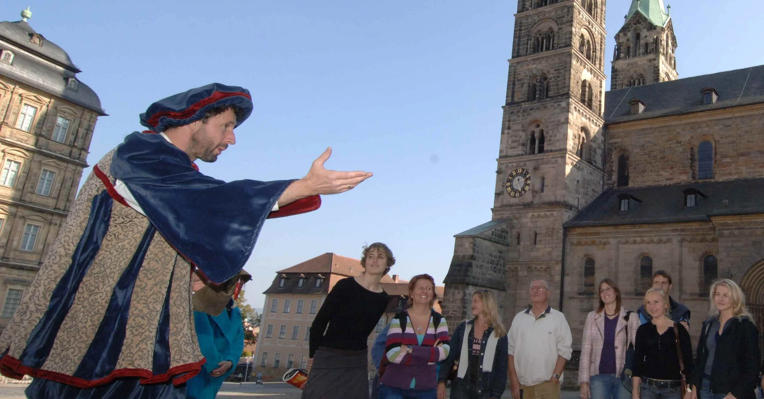 Bamberg von Kaiser Heinrich II. zum Mittelpunkt seines Reiches erkoren, bietet mit vielen Sehenswürdigkeiten die Kulisse für unsere mittelalterliche Führung. Wie lebte, liebte und starb das einfache Volk, als Dämonen und Hexen noch die Erde bevölkerten? Dein Gästeführer im mittelalterlichen Gewand begrüßt dich mit dem Heinrichstrunk aus dem Trinkhorn. Er nimmt dich mit auf eine packende Reise durch die Jahrhunderte. Gemeinsam entfachen wir mit dem Feuerschläger die Herdglut und zu guter Letzt trägst du deinen eigenen Ablass davon.