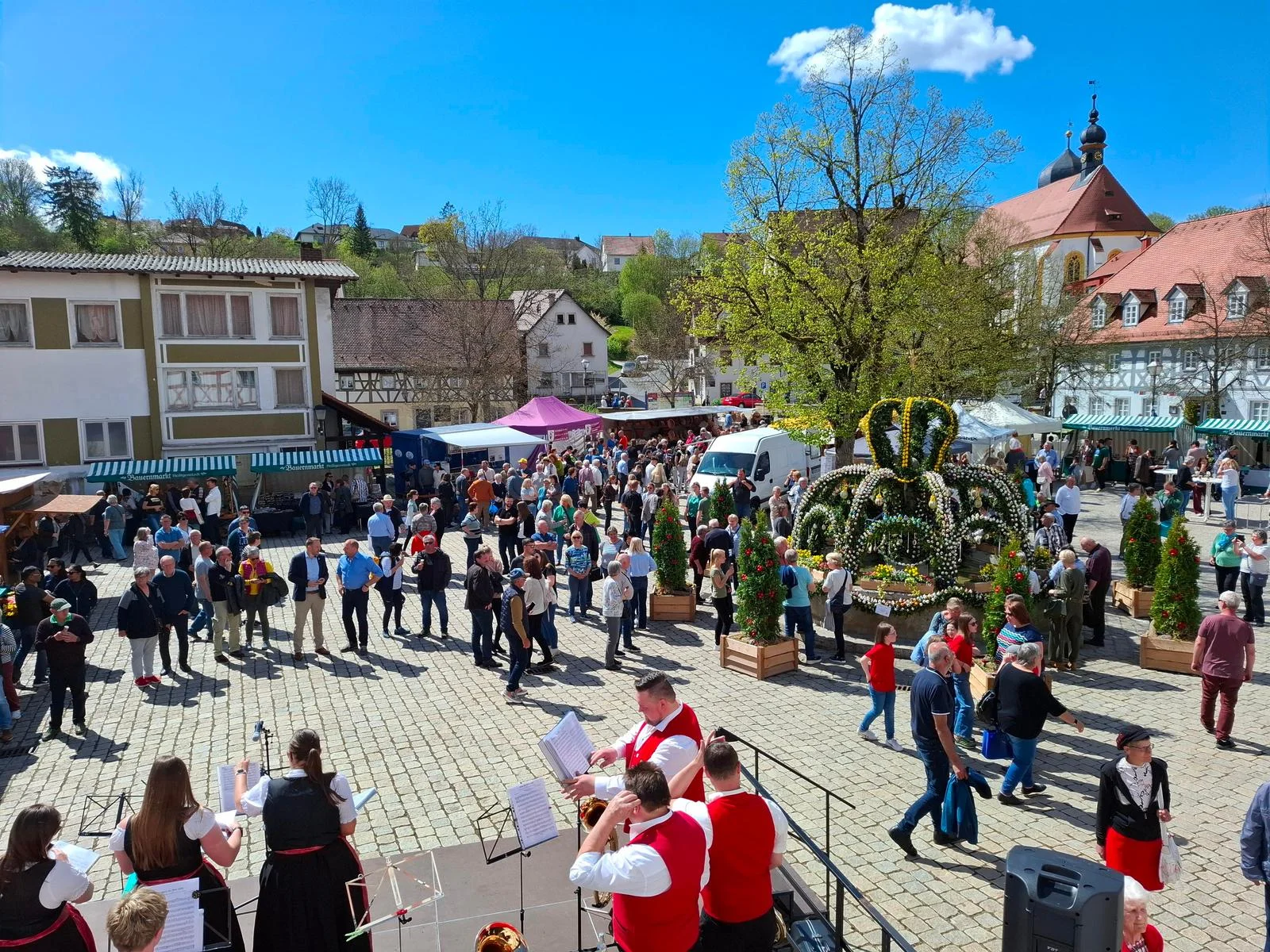 Rund um den Osterbrunnen am Marktplatz werden allerlei Produkte aus der Region und österliche Geschenk- und Dekorationsartikel angeboten.