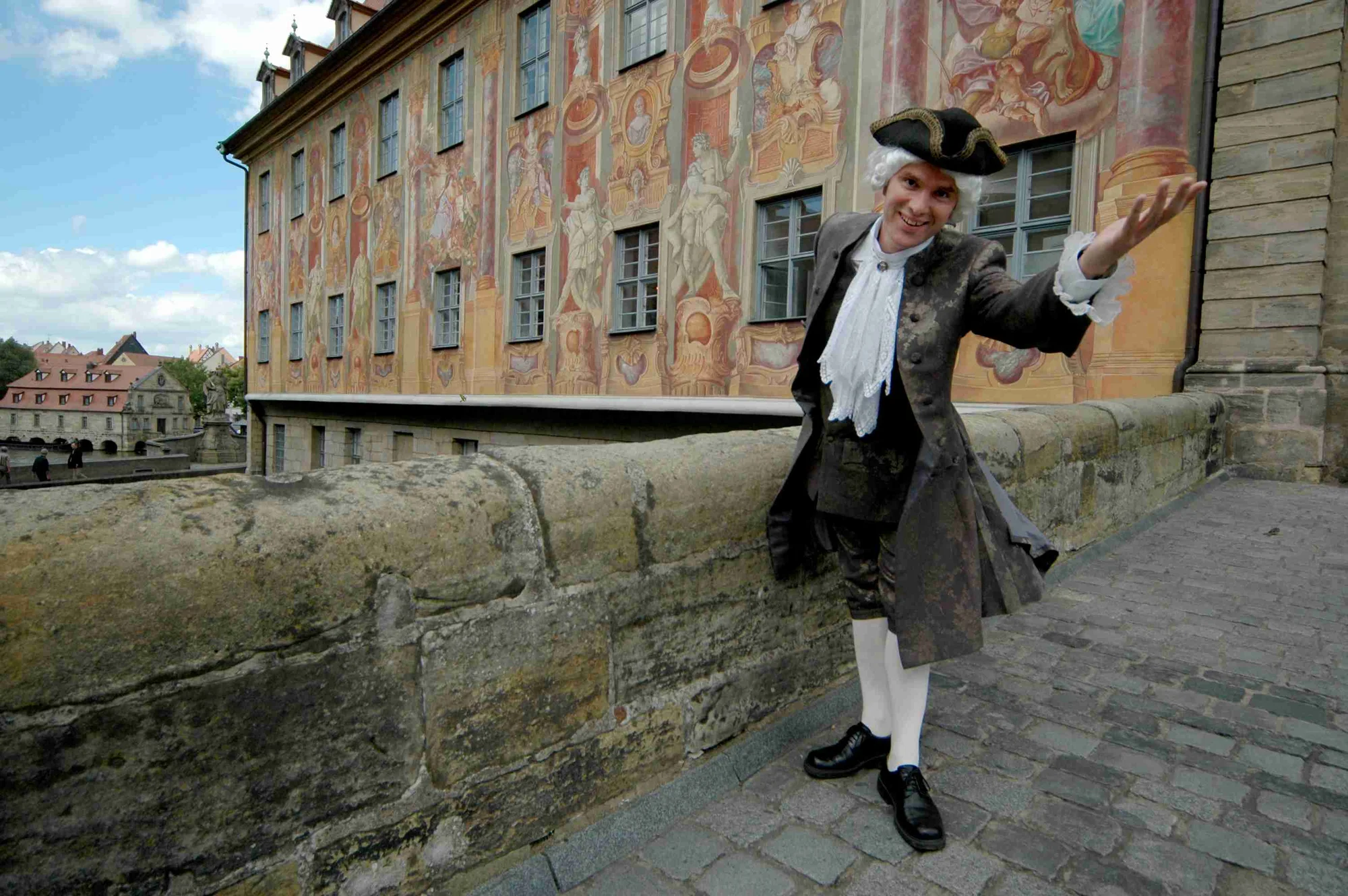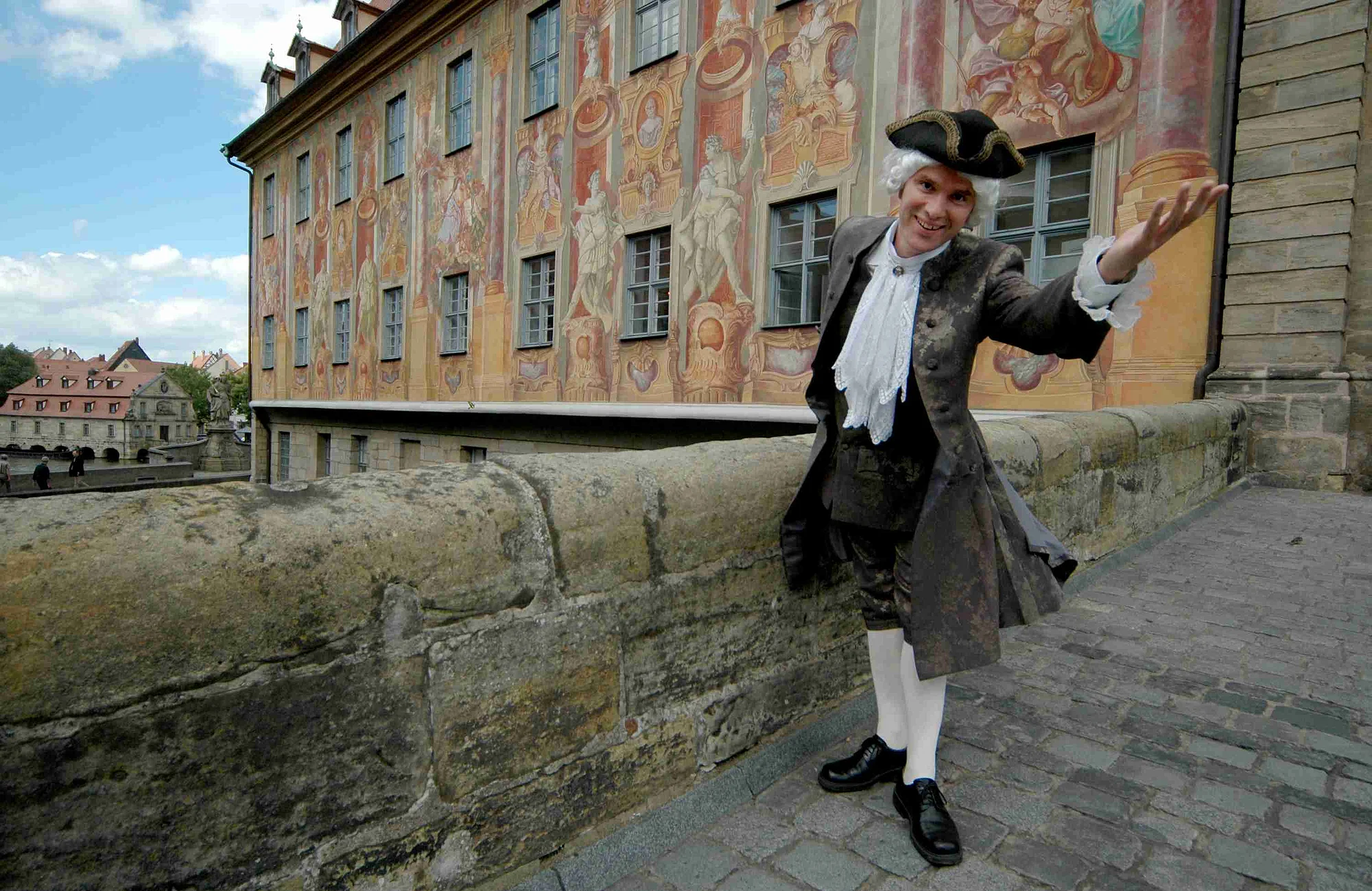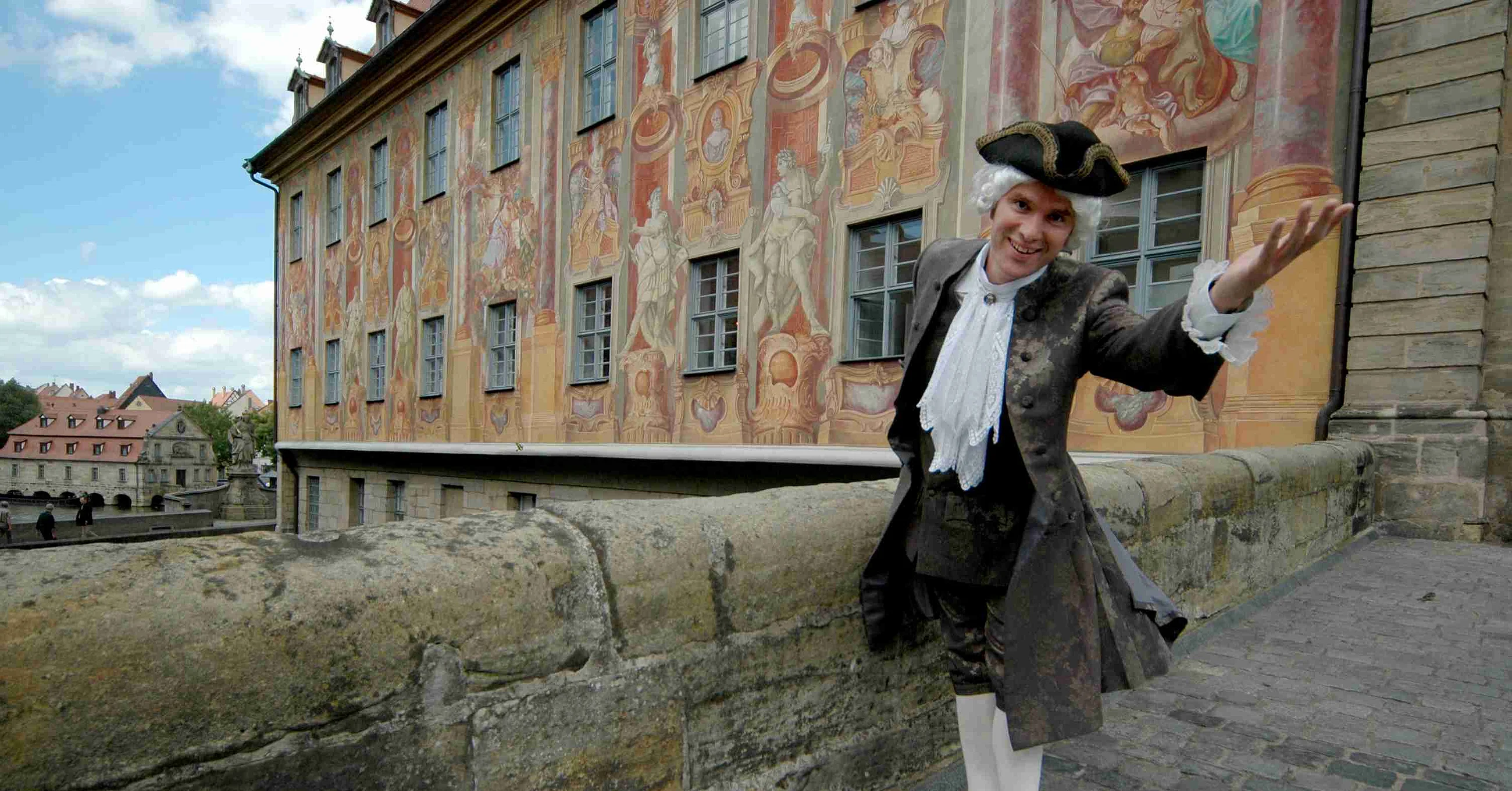 Dein fachkundiger Gästeführer erläutert Bamberger Sehenswürdigkeiten und in dramatischen Schauspielszenen erwachen längst vergangene Zeiten. Mehrere Figuren aus der Vergangenheit werden professionell inszeniert und lassen die Vergangenheit anschaulich und vergnüglich lebendig werden. Dies kann ein Mönch sein, der vom geheimnisumwitterten Tod des Papstes erzählt; der Sensenmann, der reiche Ernte hält im Ruch des Pesthauchs; die Bademagd, die geschwätzig über ihre vielfältigen reinlichen Pflichten plaudert; die liebliche Comtesse, die von barocken Sinnesfreuden schwärmt oder ein Burschenschafter, der für ein Einig Vaterland sein Blut gäbe.