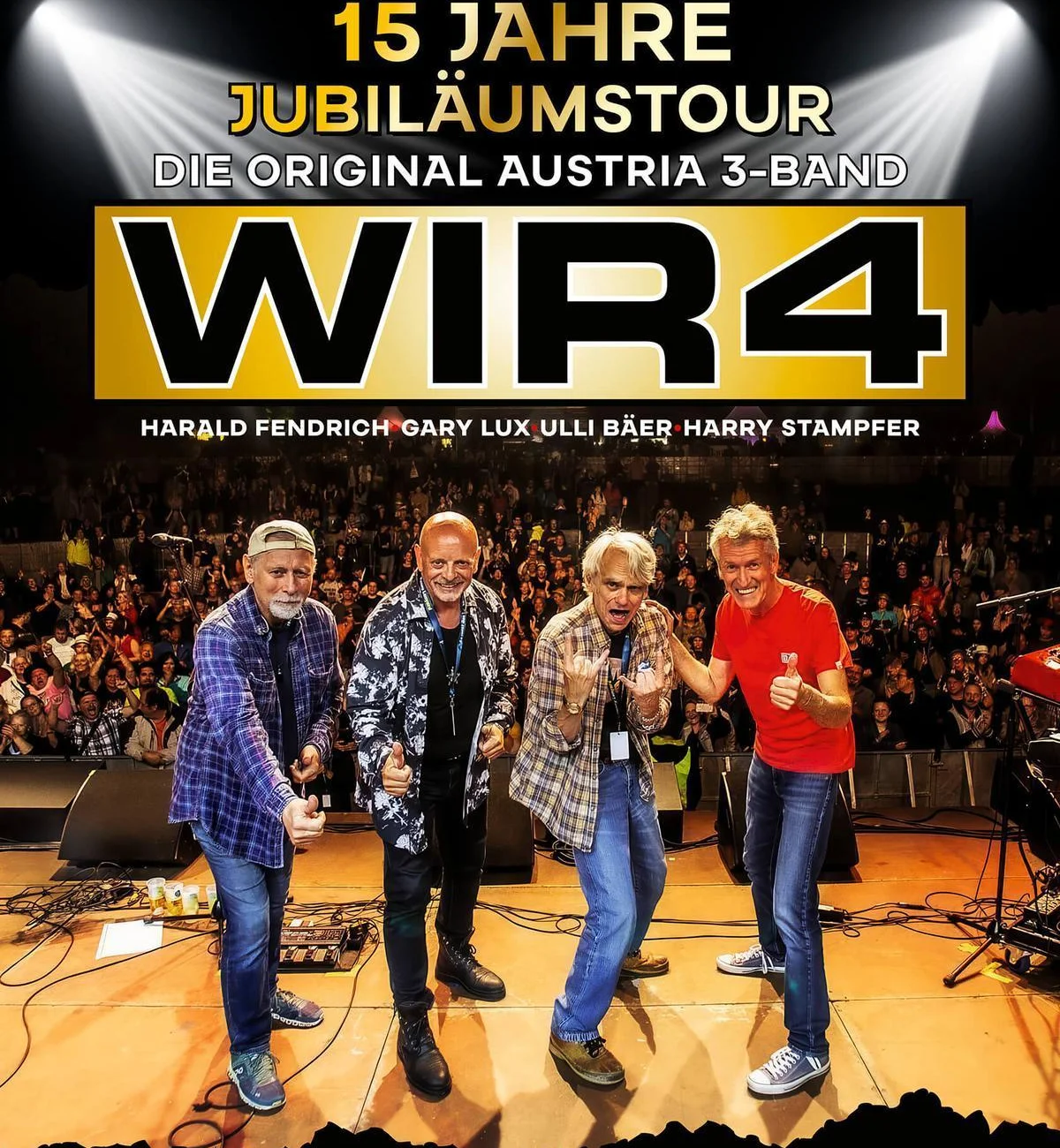 2026 wird ein besonderes Jahr für alle Fans österreichischer Musik: WIR4 lädt zur großen 15-Jahre-Jubiläumsshow. Ein mitreißendes Konzert, das das Beste aus zwei Welten vereint: unvergessene Hits von Austria 3, eigene Songs mit Charakter und Tiefgang sowie internationale Covers in wienerischen Übersetzungen. Den roten Faden bilden die humorvollen und hintergründigen Moderationen, die längst zum Markenzeichen von WIR4 geworden sind.